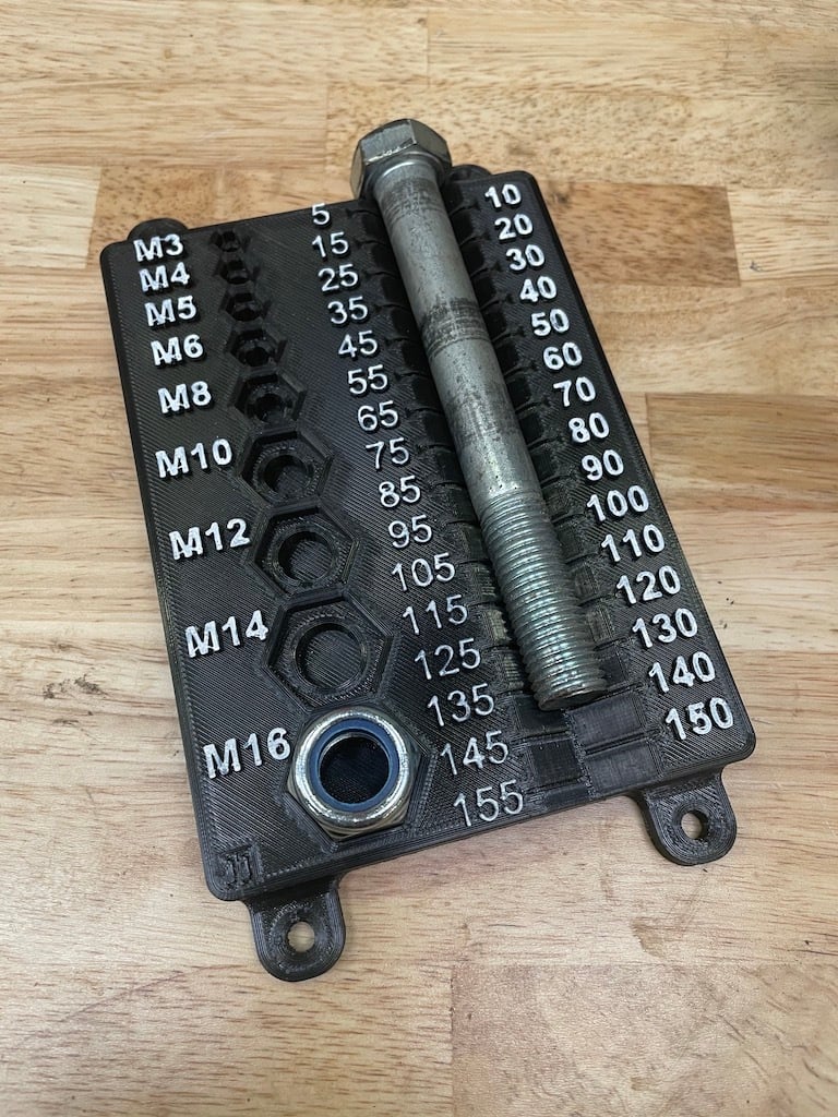 Tämä pulttien lajittelutyökalu on suunniteltu auttamaan pulttien ja muttereiden järjestämisessä metrisen standardin mukaisesti. Se toimii tehokkaana mittaustyökaluna, jonka avulla voidaan tunnistaa koot M3:sta M16:een sekä pituudet 5 mm:stä 155 mm:iin, jaettuna 5 mm:n välein.