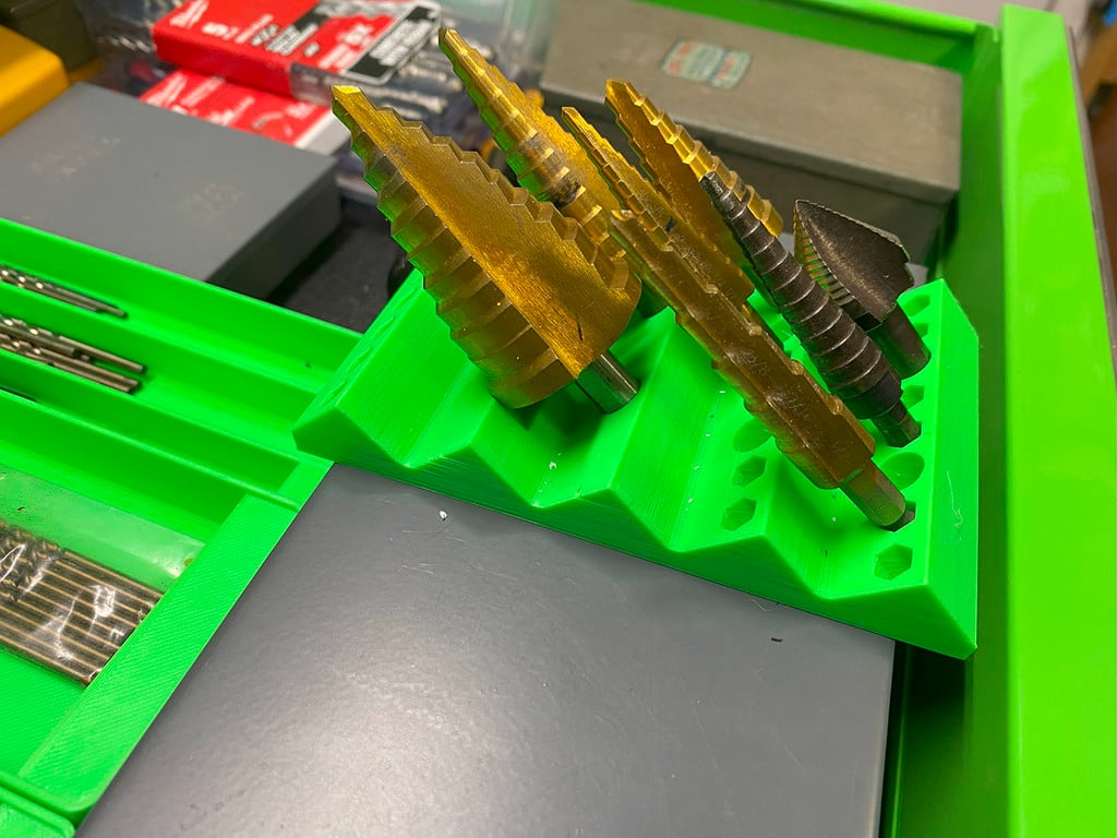 Tämä käytännöllinen työkalunjärjestäjä on suunniteltu pitämään uppoporasi ja vaiheporasi siististi yhdessä ja helposti saatavilla. Se auttaa luomaan järjestystä työpajaasi tai työtilaasi antamalla jokaiselle erikoisporanterälle oman kiinteän paikan. Tämän järjestäjän avulla löydät helposti oikean poranterän tehtävään, mikä säästää aikaa ja vähentää sotkua. Se on ihanteellinen ratkaisu kaikille, jotka haluavat optimoida työkalujen säilytyksen ja varmistaa, että tärkeät poranterät ovat aina käden ulottuvilla.