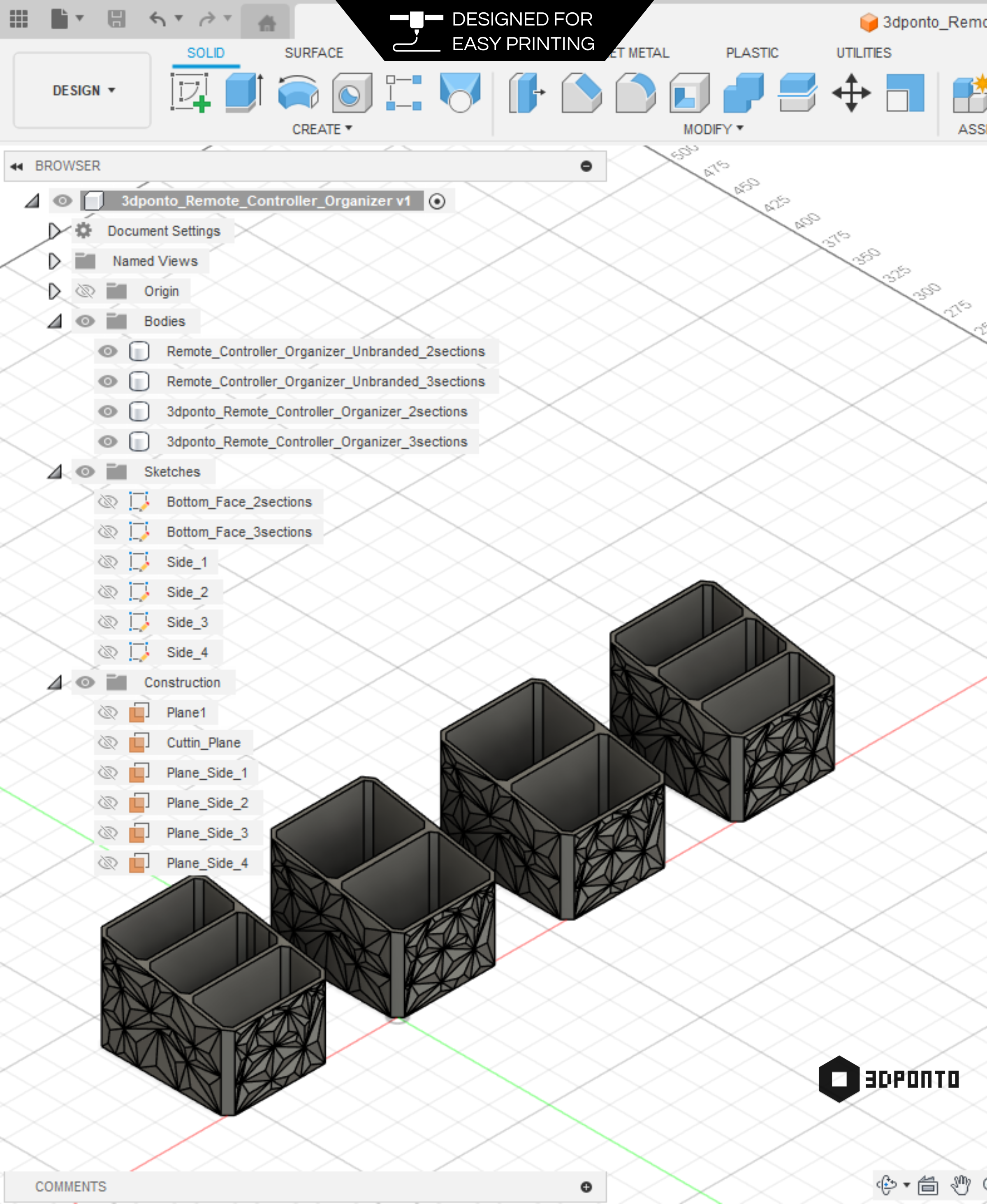 Tämä moderni 3D-tulostettu kaukosäätimen järjestäjä on suunniteltu luomaan järjestystä ja yleiskuvaa kotiisi. Se on saatavana kahdella tai kolmella lokerolla, mikä tarjoaa tilaa useille kaukosäätimille – mukaan lukien suuremmille malleille, kuten ilmastointilaitteiden kaukosäätimille. Avoimet lokerot varmistavat, että pääset helposti käsiksi painikkeisiin ja voit käyttää laitteitasi poistamatta kaukosäätimiä pidikkeestä.