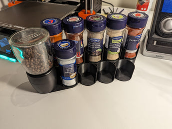 Yksittäinen maustehylly, joka on suunniteltu 9 'Santa Maria' -maustepurkin ja 1 Ikea IHÄRDIG -maustemyllyn säilyttämiseen. Jokaisen maustepurkin sisähalkaisija on 42,2 mm. Näin mausteiden järjestäminen ja säilyttäminen on helppoa ja kätevää.