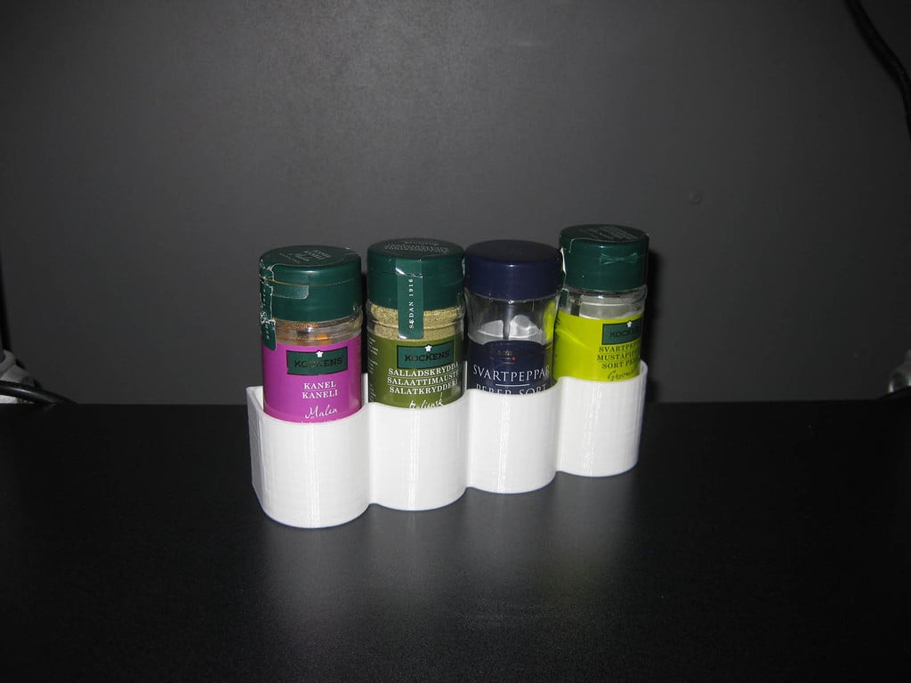 Yksinkertainen pidike neljälle maustepurkille. Korkeus 42 mm ja leveys 183 mm, ja purkkien enimmäishalkaisija on 43 mm. Tämän pidikkeen avulla voit helposti säilyttää mausteet ja luoda siistin keittiöympäristön.