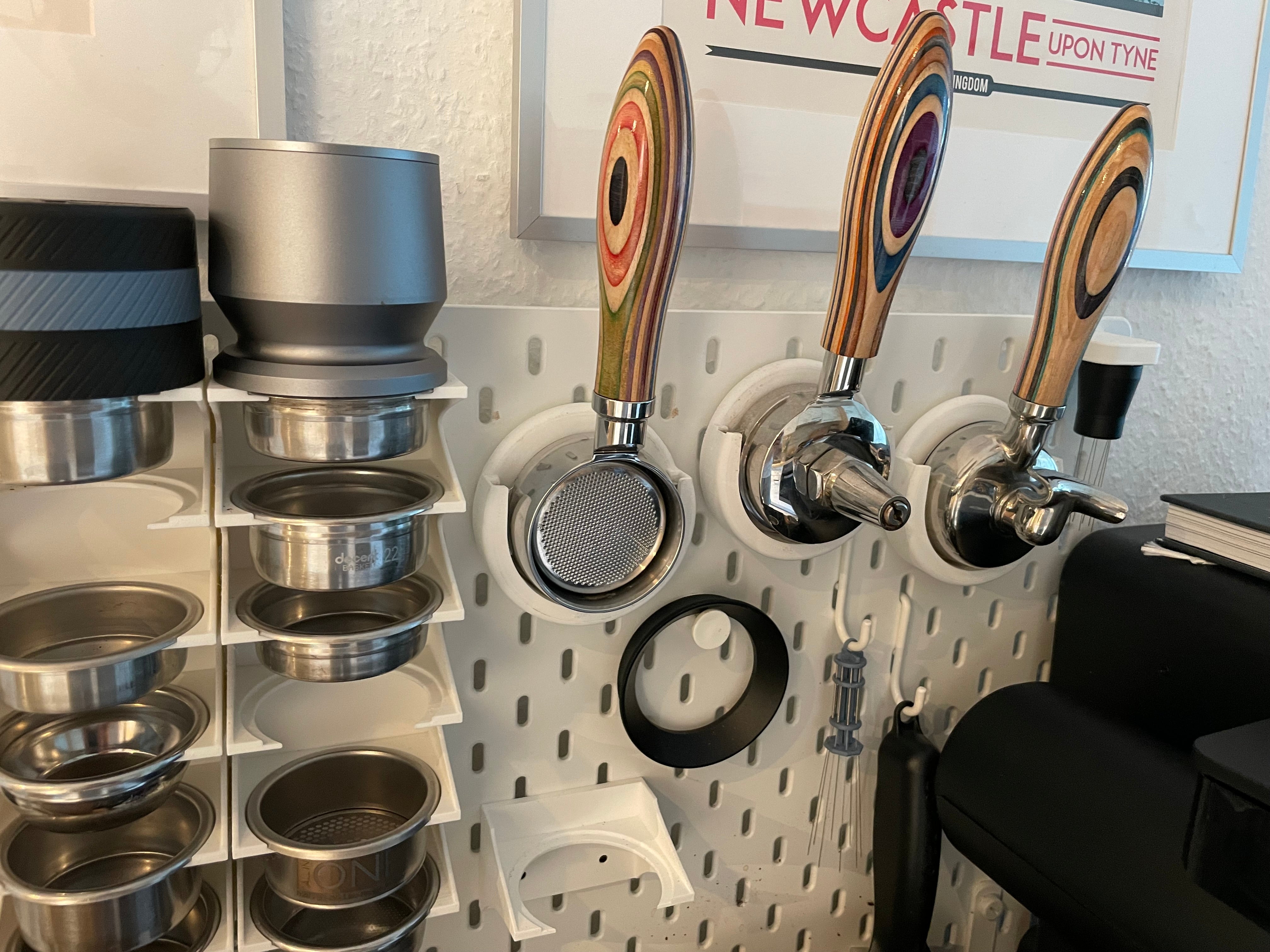 Tämä käytännöllinen 58 mm:n portafilteripidike on suunniteltu erityisesti optimoimaan espresso-kokoonpanoasi Decent Espresso -laitteiden avulla. Se on luotu sopimaan täydellisesti IKEA Skadis -järjestelmääsi, mikä tarjoaa organisoidun ja helposti saatavilla olevan säilytysratkaisun portafiltereillesi. Pidike on huolellisesti muokattu sopimaan jopa 82,4 mm leveille portafiltereille, mikä takaa ihanteellisen istuvuuden erilaisille Decent Espresso -portafiltereille, mukaan lukien sekä vakio-, tee- että pohjattomat versiot. Asennus on yksinkertainen, koska se käyttää uudelleen tuttua "Skadis Universal Hook" -koukkua. Tällä portafilteripidikkeen avulla voit pitää espresso-tarvikkeesi siistinä ja työskentelyalueesi selkeänä.