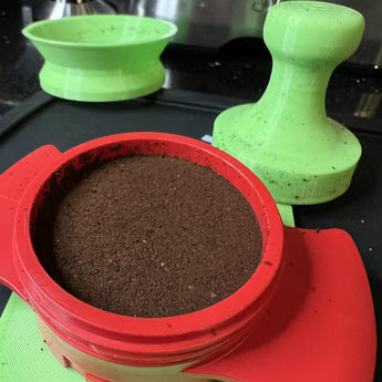 Metallisuodattimen suojaamiseksi tamppauksen aikana mukana on erityinen tamppausteline. Tämä teline tukee suodatinta takaa, jolloin voit käyttää tarvittavaa painetta kiinteän ja tasaisen kahvikiekon saamiseksi ilman suodattimen taivutusriskiä. Tämä varmistaa, että kahvinporosi on optimaalisesti valmisteltu haudutusta varten.