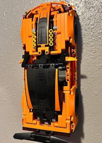Helppo seinäkiinnike Lego Technicin oranssille Corvetelle (#42093). Tämän seinäkiinnikkeen avulla voit helposti asettaa Lego-mallisi esille siististi ja näyttävästi ja pitää samalla sarjasi järjestyksessä ja suojassa.