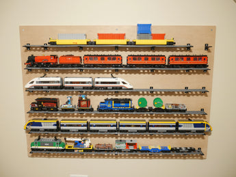 Käytä tätä LEGO-junan seinäkiinnikettä LEGO-juniesi esittelyyn. Tämä pidike auttaa pitämään LEGO-junasi poissa lattialta/pöydältä, kun ne eivät ole käytössä. Voit käyttää näitä myös junaradan ajamiseen huoneesi ympäri! Pidike on suunniteltu helppoa asennusta varten ja varmistaa, että LEGO-junasi pysyvät turvallisesti paikallaan.