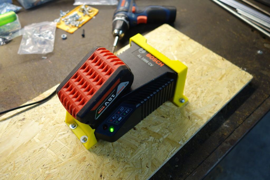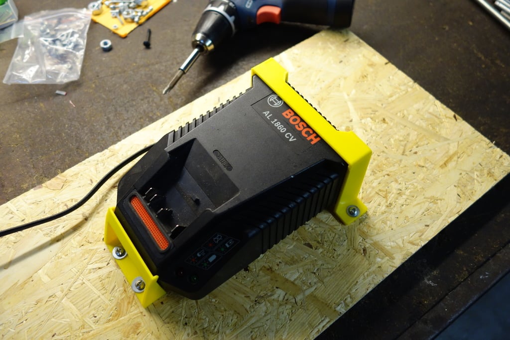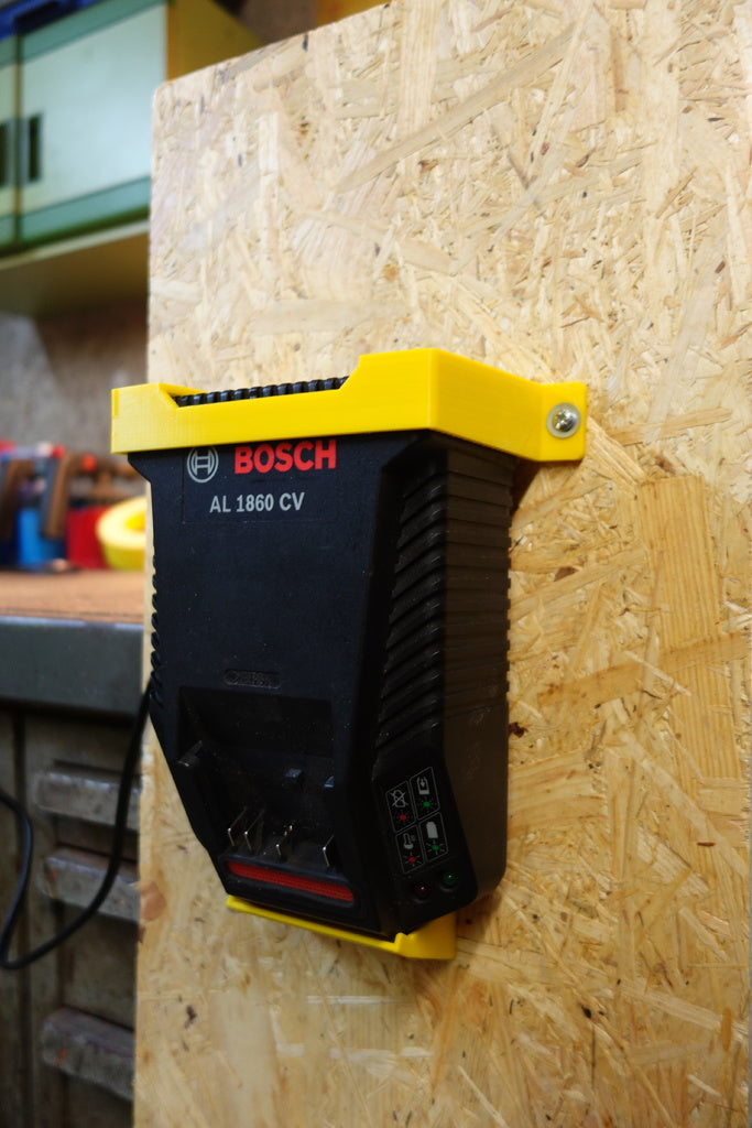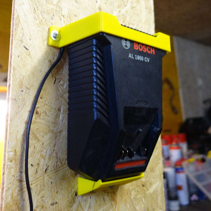 Tämä seinäteline on suunniteltu Bosch AL 1860 CV -laturiani (BC 630 US-versio), jotta voin kiinnittää laturin seinälle. Tämä tarkoittaa, että se vie vähemmän tilaa pöydälläni.