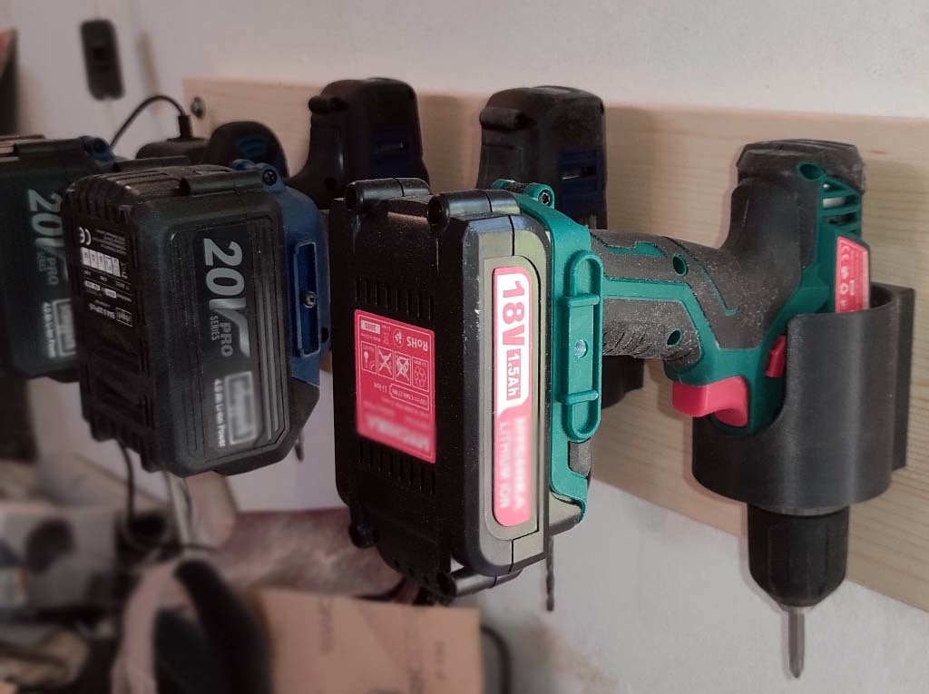 Tämä sähkötyökalun/poran seinäteline on yksinkertainen ja helppo tulostaa. Se on suunniteltu sopimaan käytännössä minkä tahansa kokoiseen tai merkkiseen työkaluun ja mahdollistaa työkalujen säilyttämisen ilman, että poranterät tarvitsee poistaa.