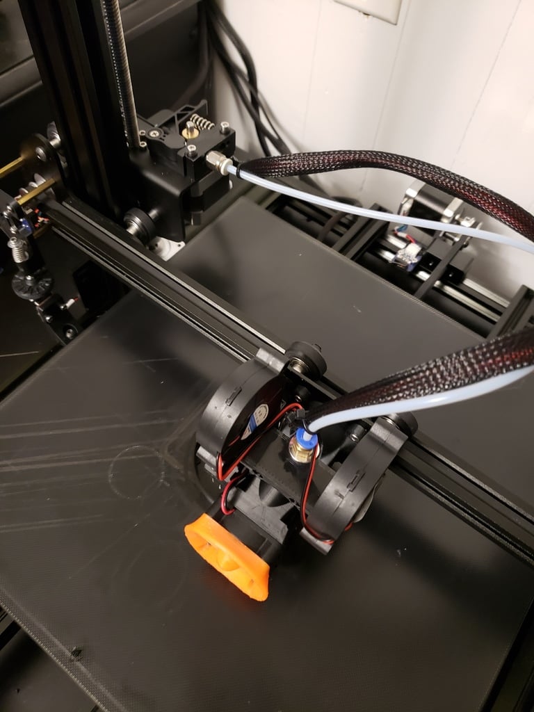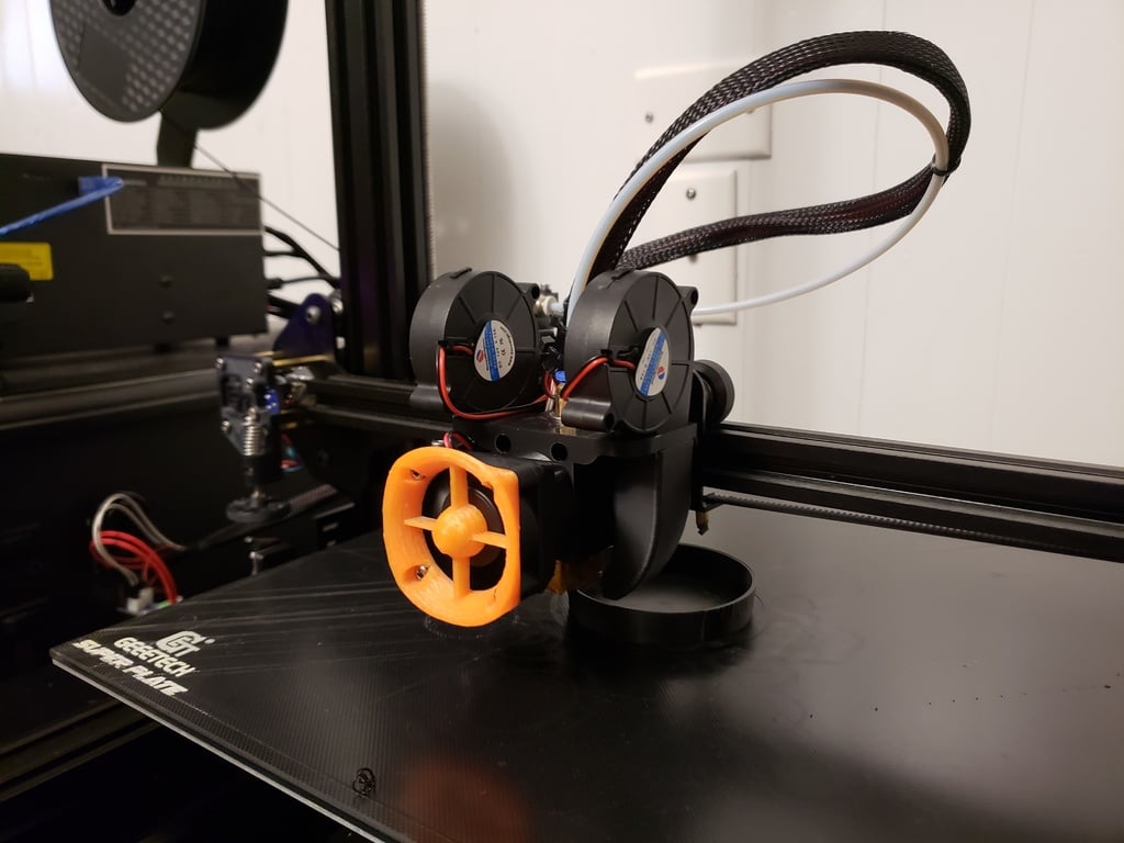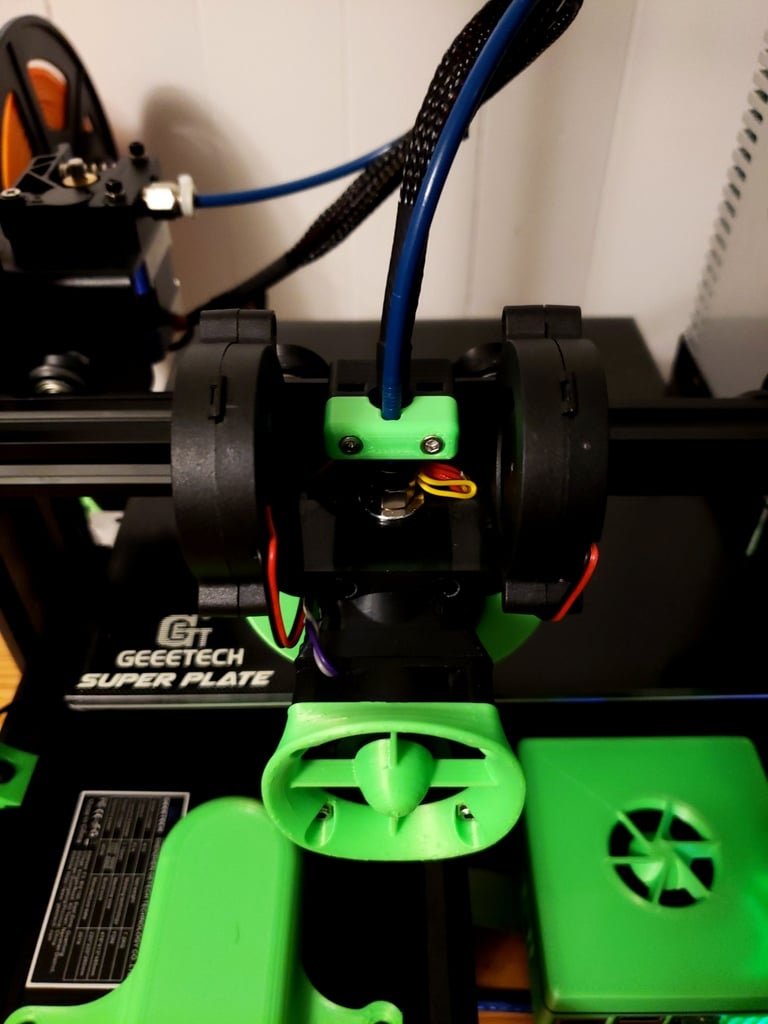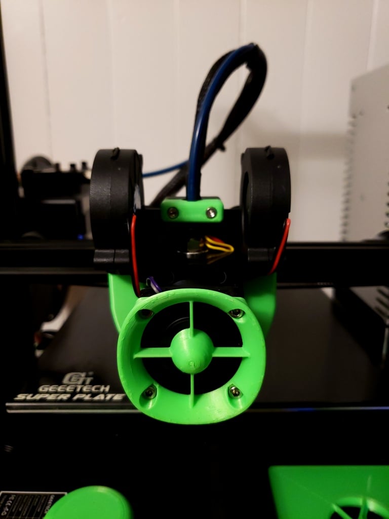 Tämä mukautettu kiinnike tarjoaa vankan ratkaisun Geeetech A10- tai Geeetech A30 -3D-tulostimesi parantamiseen. Se tarjoaa vakaan alustan E3D V6 -kuumennuspään integrointiin, joka tunnetaan suorituskyvystään ja luotettavuudestaan 3D-tulostuksessa. Suunnittelu tukee lisäksi kahden 5015-puhaltimen asennusta, mikä on olennaista tulosteen tehokkaalle jäähdytykselle, mikä johtaa puhtaampiin ja tarkempiin tulosteisiin. Kiinnikkeessä on myös integroitu kaapelituki, joka edistää parempaa kaapelinhallintaa ja järjestelmällisempää asennusta. Käyttäjille, jotka haluavat lisätä automaattisen tason tasaamisen, on myös mahdollisuus asentaa BLTouch-anturi. Tämä päivitysratkaisu tarjoaa enemmän joustavuutta ja parannettuja tulostustuloksia optimoimalla tulostimesi kuumennuspään ja jäähdytysjärjestelmät.