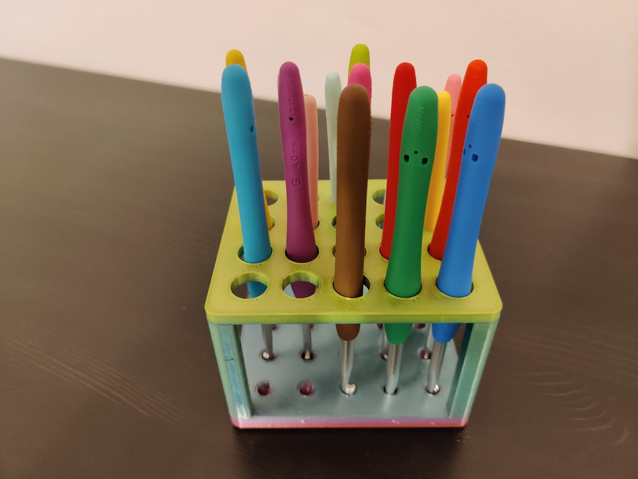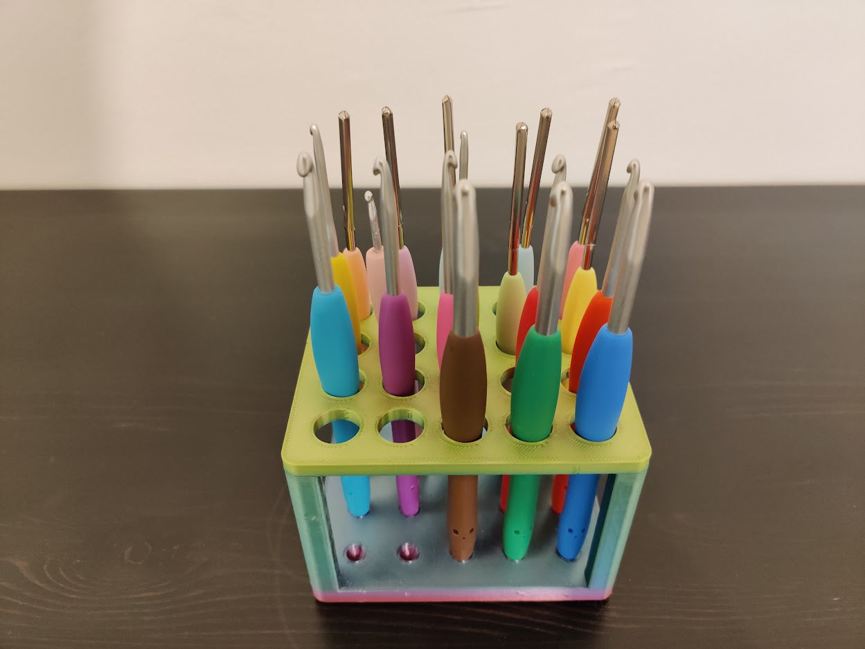 Järjestä työpisteesi tällä älykkäällä säilytysratkaisulla virkkuukoukuillesi ja kynillesi. Tämä käytännöllinen pidike on suunniteltu pitämään työkalusi turvallisesti paikallaan, jotta voit helposti löytää ne, kun tarvitset niitä. Se on täydellinen pöytäorganisoija sekä harrastajille että ammattilaisille, jotka työskentelevät langan ja ompelun parissa.