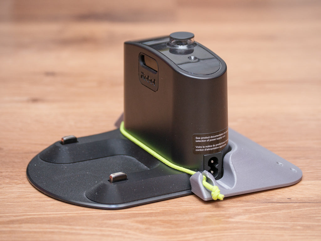 Pidike on erityisen kätevä Roomban pysäköintiin huonekalujen, kuten sohvan, alle, jossa muuten puuttuu kiinteä pinta latausaseman tukemiseen. Siistin ulkonäön säilyttämiseksi sisäänrakennettuja reikiä voidaan käyttää yhdessä kuminauhan tai muun kaapelin kanssa, joka toimii tehokkaana kaapelitelineenä latausaseman kaapelin kokoamiseen ja järjestämiseen.