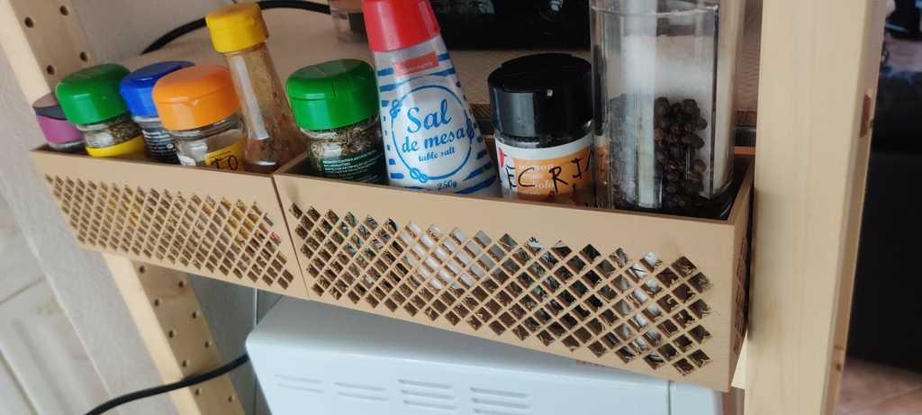 Pidä mausteesi järjestyksessä tällä käytännöllisellä maustetelineellä, joka on suunniteltu erityisesti IKEAn suosittuun IVAR 50 cm:n hyllyjärjestelmään. Tämän älykkään säilytysratkaisun avulla voit järjestää maustelasisi tehokkaasti niin, että ne ovat aina käden ulottuvilla ruoanlaiton aikana. Pidike on suunniteltu sopimaan täydellisesti vaakasuoran hyllyn alle, mikä takaa optimaalisen vakauden ja tilankäytön. Tukeva alaosan tuki lisää kestävyyttä ja antaa maustehyllyllesi lisävastusta. Turvalliseen kiinnitykseen tarvitaan 5 puuruuvia itse pidikkeelle ja lisäksi 3 ruuvia alaosan tuelle. Lisäksi kaksi pääosaa kootaan yhdellä M3-ruuvilla. Suosittelemme käyttämään M3 x 15 mm:n puuruuveja tukevaan asennukseen. Luo järjestelmällisempi ja toimivampi keittiö tällä tyylikkäällä maustesäilytyksellä.