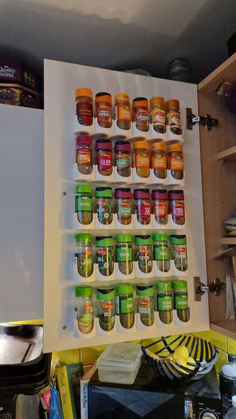 Tämä käytännöllinen maustehylly on suunniteltu asennettavaksi kaapin ovien sisäpuolelle, mikä optimoi keittiön säilytystilan. Hylly tarjoaa jäsennellyn ratkaisun mausteillesi, joten ne on helppo löytää ja käyttää ruoanlaiton aikana. Se auttaa pitämään kaapin järjestyksessä ja luo järjestetymmän työtilan. Tuote on toimiva lisä parantamaan mausteiden säilytystä ja edistämään siistiä keittiöympäristöä.