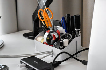 Tämä käytännöllinen työpöydän järjestäjä on suunniteltu auttamaan sinua pitämään työtilasi järjestyksessä. Siinä yhdistyvät tehokas säilytystila toimistotarvikkeillesi ja älykäs ratkaisu kaapelien hallintaan. Useiden erillisten lokeroiden avulla voit helposti järjestää kynät, lyijykynät, muistikirjat ja muut pikkutavarat niin, että ne ovat aina käden ulottuvilla.