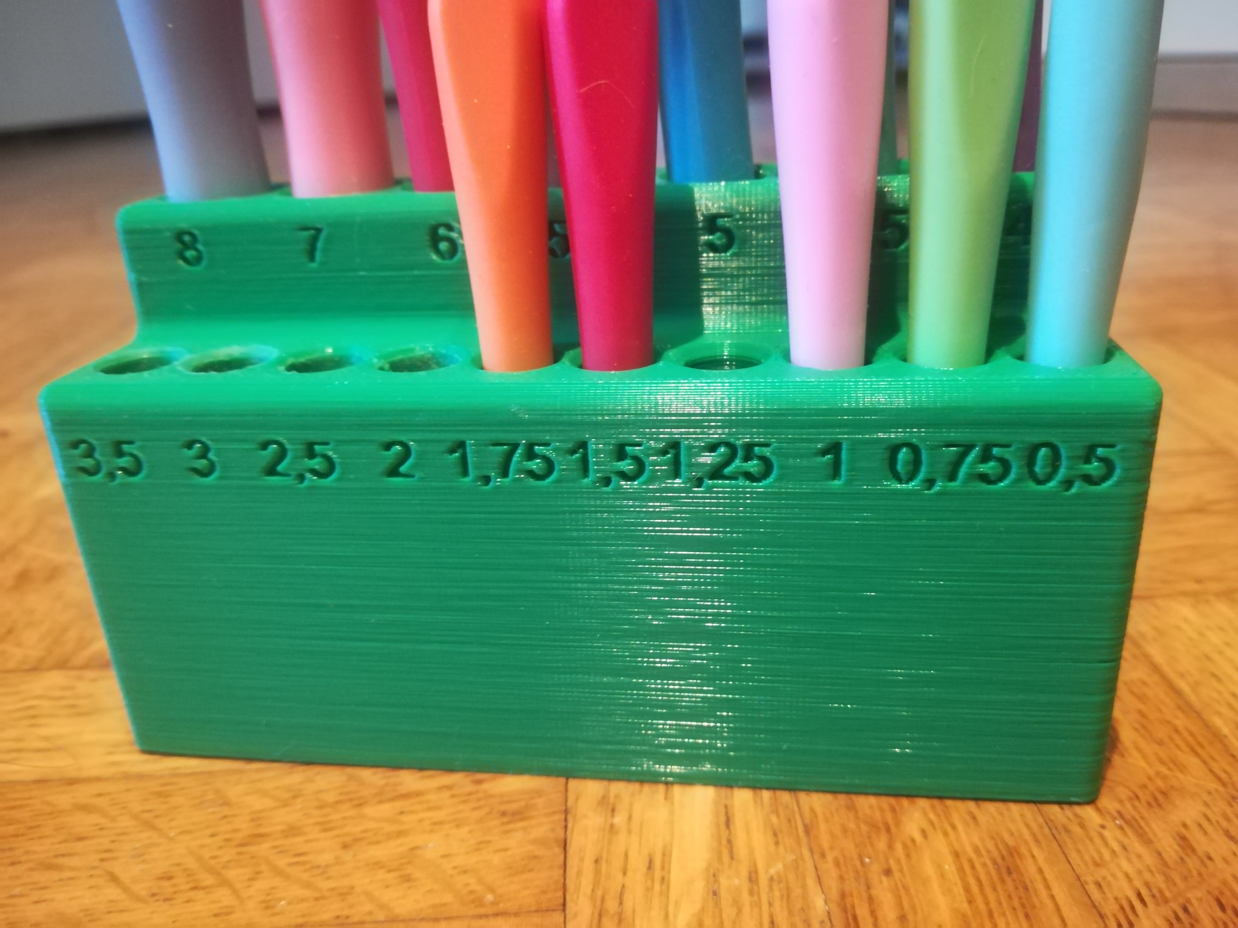 Tämä pidike on täydellinen ratkaisu suosikkikoukkuvirkatyökoukkujesi säilyttämiseen. Siihen mahtuu 17 erikokoista virkkuukoukkua, joten työkalujesi pitäminen järjestyksessä ja oikean koon löytäminen projektiisi on helppoa. Reikäkokoilla 12 mm - 8 mm teline mukautuu monenlaisiin virkkuukoukkuihin, joten sinulla on ne aina käden ulottuvilla, kun inspiraatio iskee.