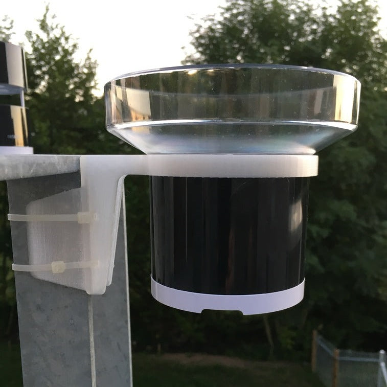 Yksinkertainen ripustin Netatmo-sademittarille, jotta varmistat, että se kerää kaiken veden. Se on suunniteltu kaiteelle, jonka syvyys on 41 mm ja leveys 9 mm.