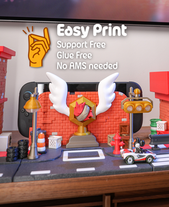 Tämä Podium Pit Stop -telakka on suunniteltu Nintendo Switch 2 -konsolillesi ja yhdistää toiminnallisuuden Turbo District -malliston ainutlaatuiseen kilpa-aiheiseen muotoiluun. Se varmistaa, että kaikki portit ja tuuletus pysyvät täysin käytettävissä. Malli kootaan helposti ilman liimaa ja toimii myös tyylikkäänä telineenä.
