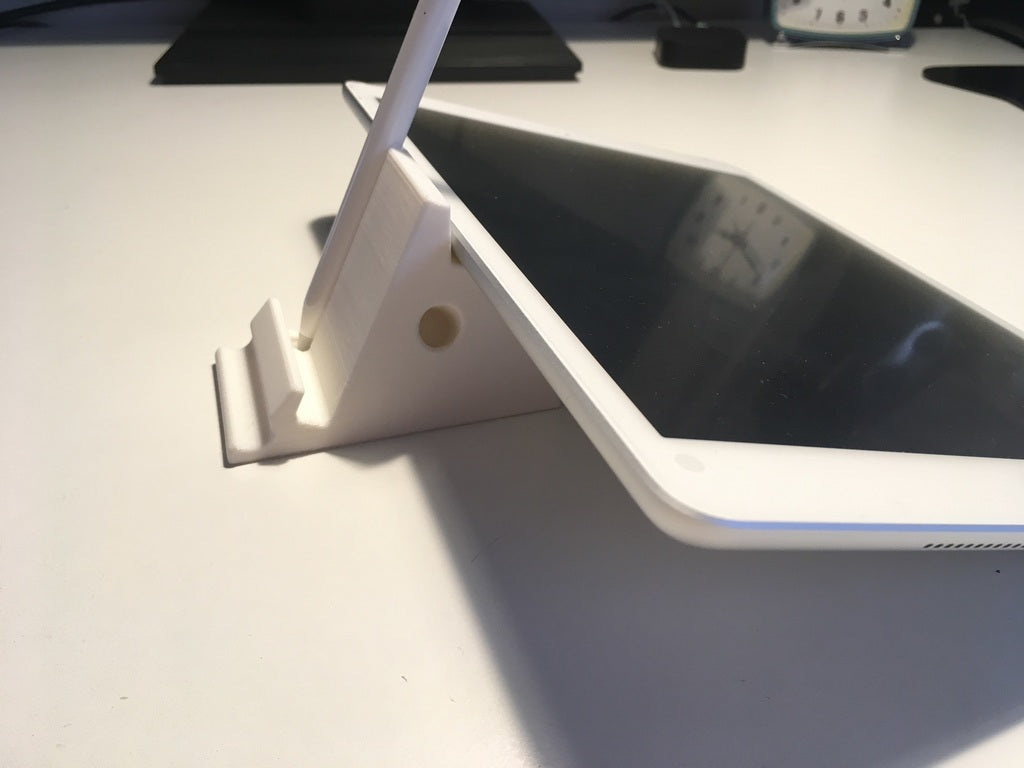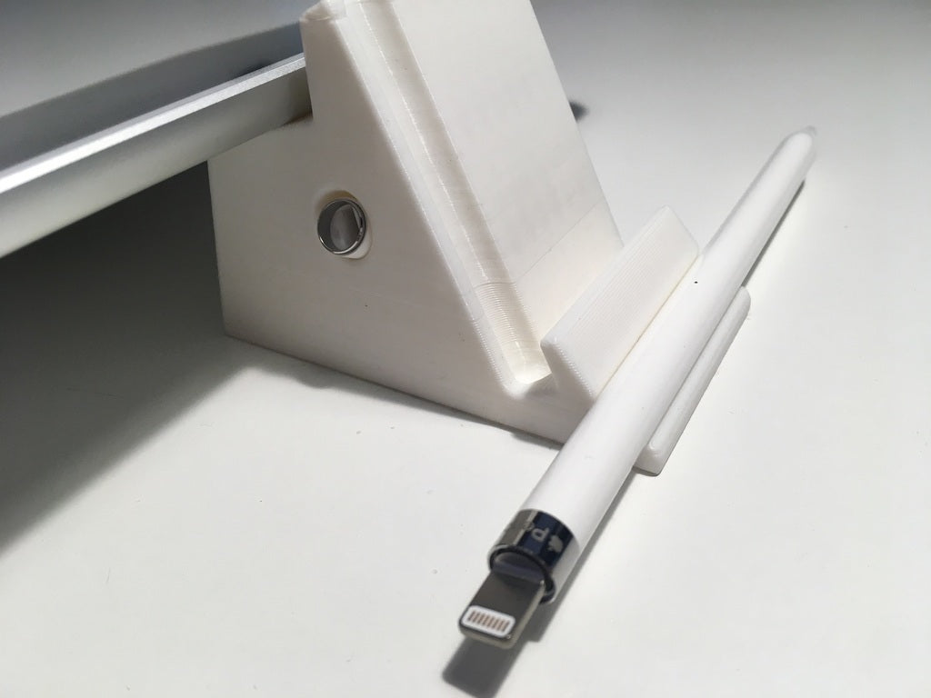 2-suuntainen iPad-teline, jossa on pidike Apple Pencilille ja sen suojukselle. Jalusta pitää iPadin mukavassa asennossa videoiden katselua varten, kun taas Apple Pencil -pidike pitää kynän ja korkin järjestyksessä ja käden ulottuvilla.