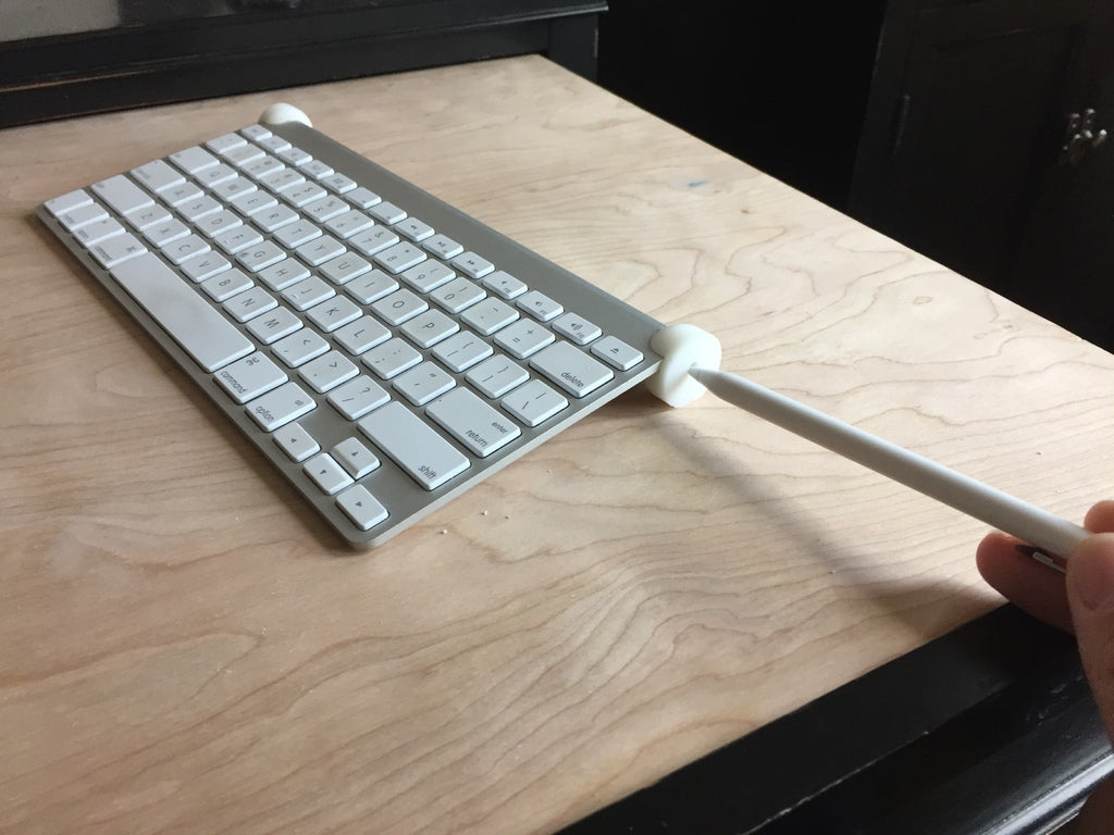 Tämä on suojus Applen langattoman näppäimistön virtapainikkeelle. Suojus estää näppäimistöä kytkeytymästä vahingossa päälle, kun kuljetat sitä laukussasi. Se voidaan aktivoida lähes millä tahansa kirjoitusvälineellä, myös Apple Pencilillä!