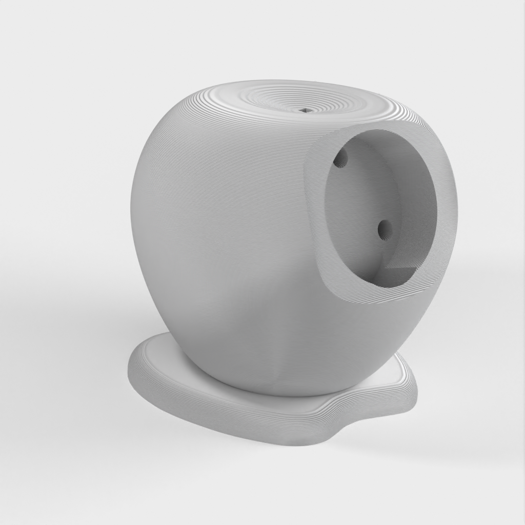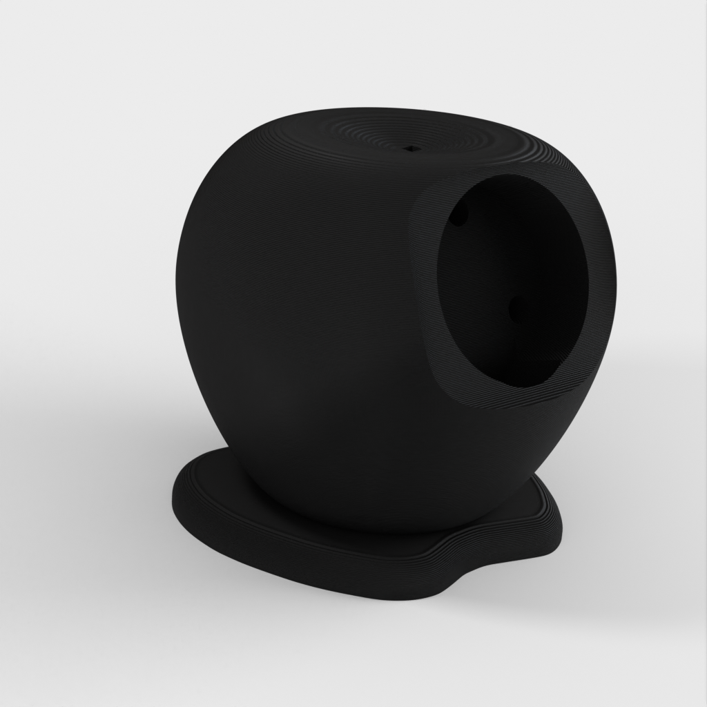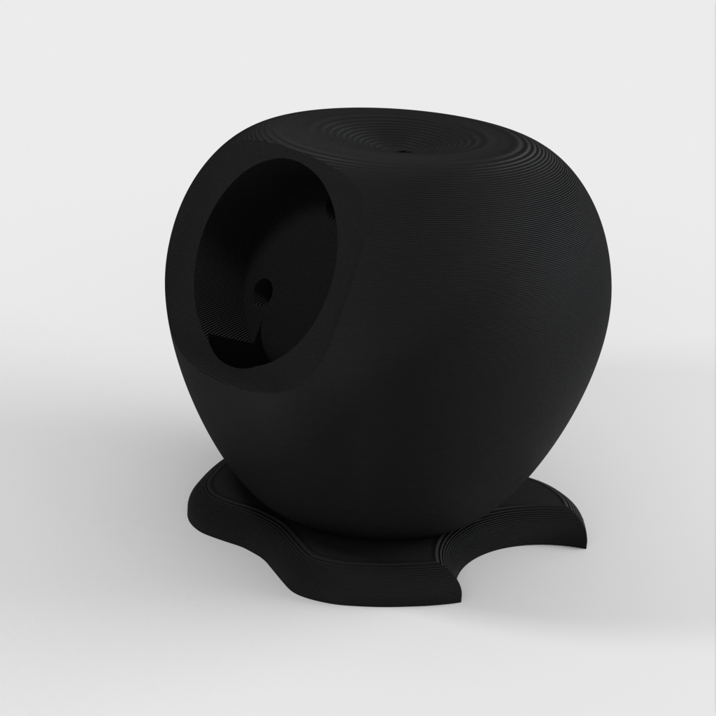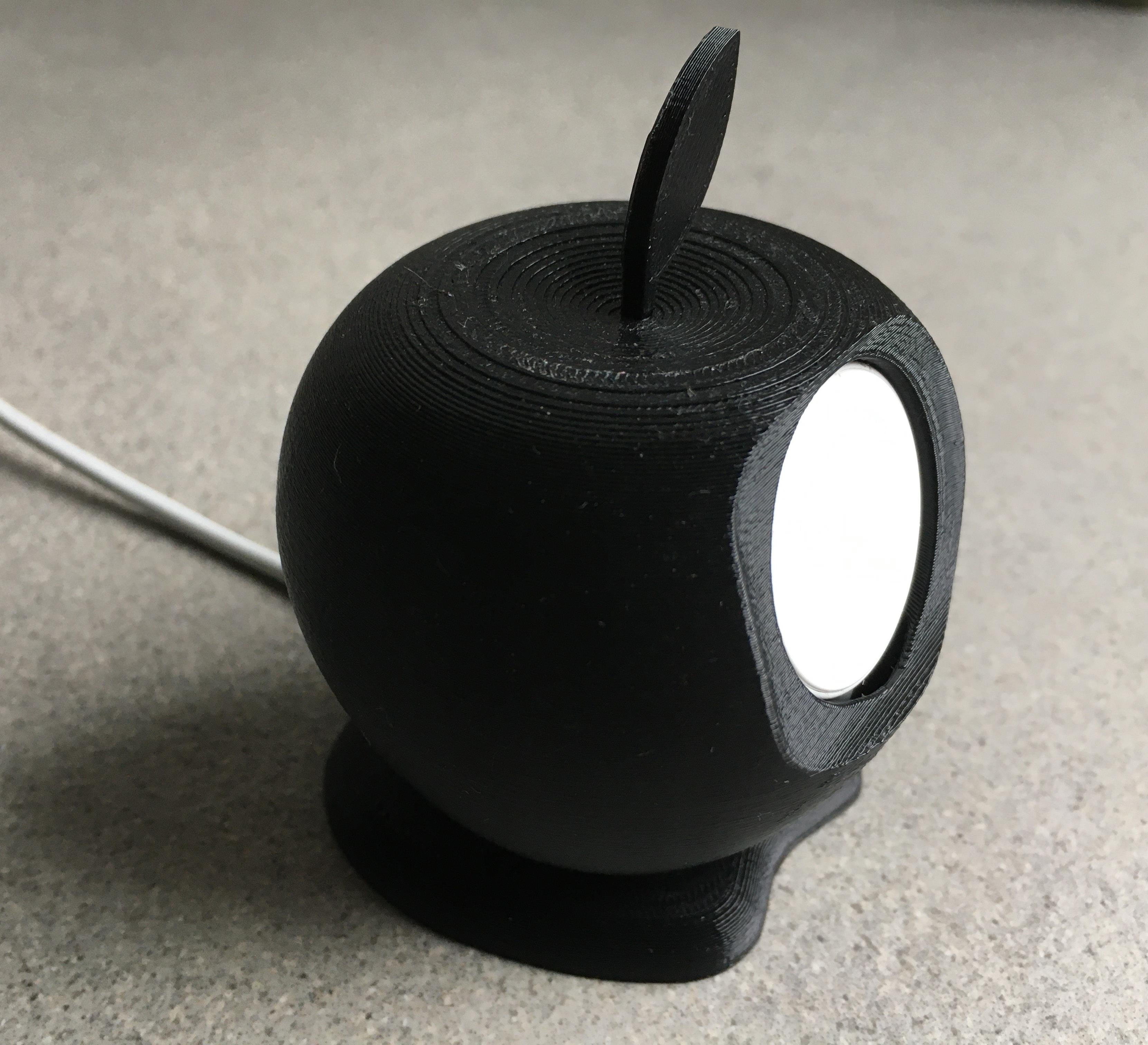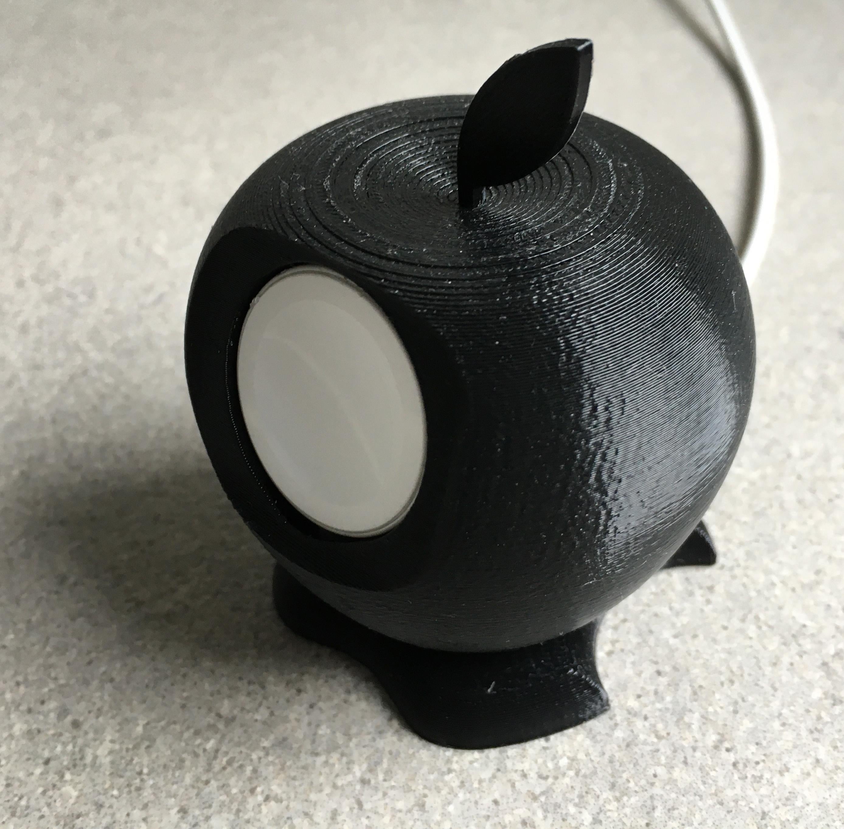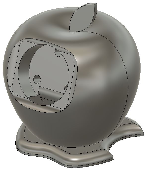Latausteline Apple Watchille (40 mm), joka on suunniteltu Apple-logon muotoon. Kaapeli viedään reiän läpi ja laturi napsahtaa paikalleen. Mallissa on takana reiät, joista laturi voidaan tarvittaessa liu'uttaa ulos.