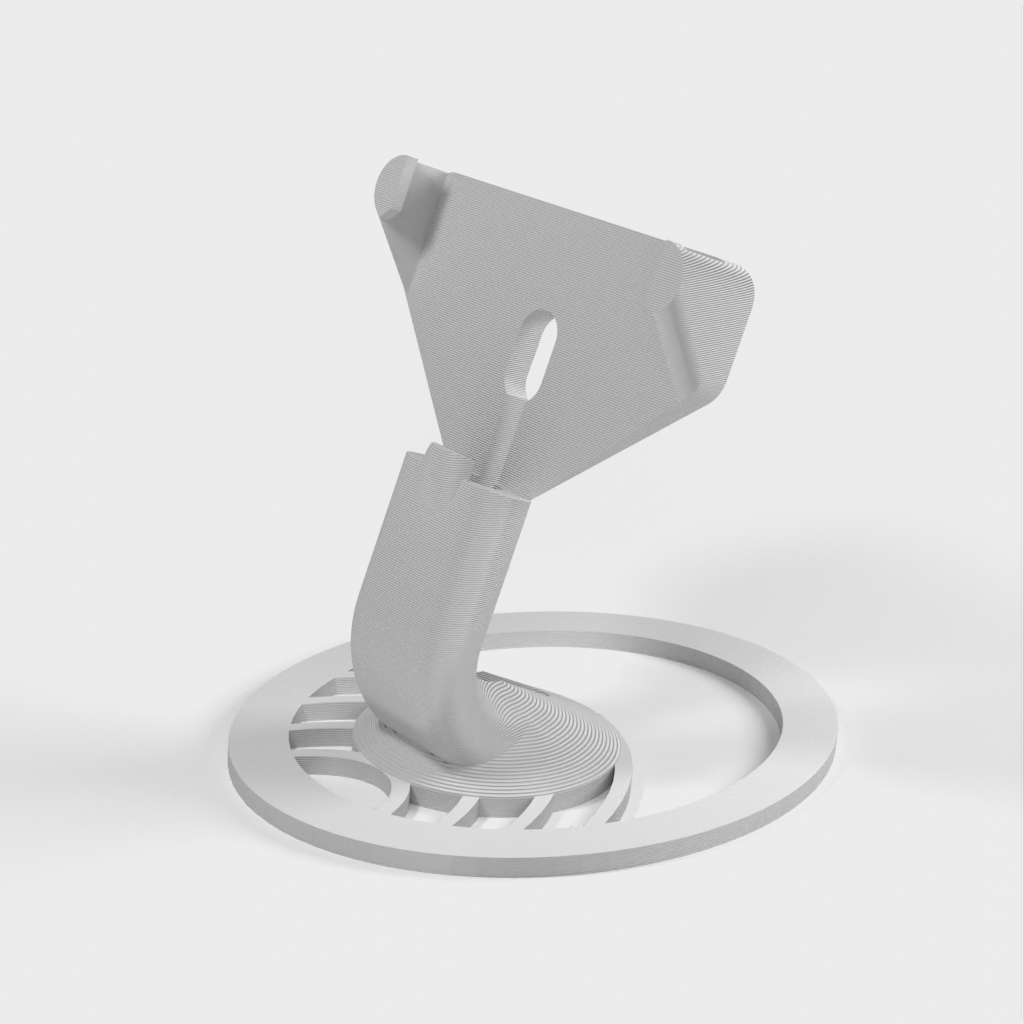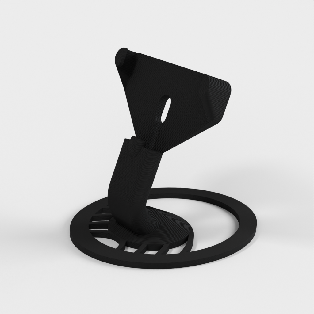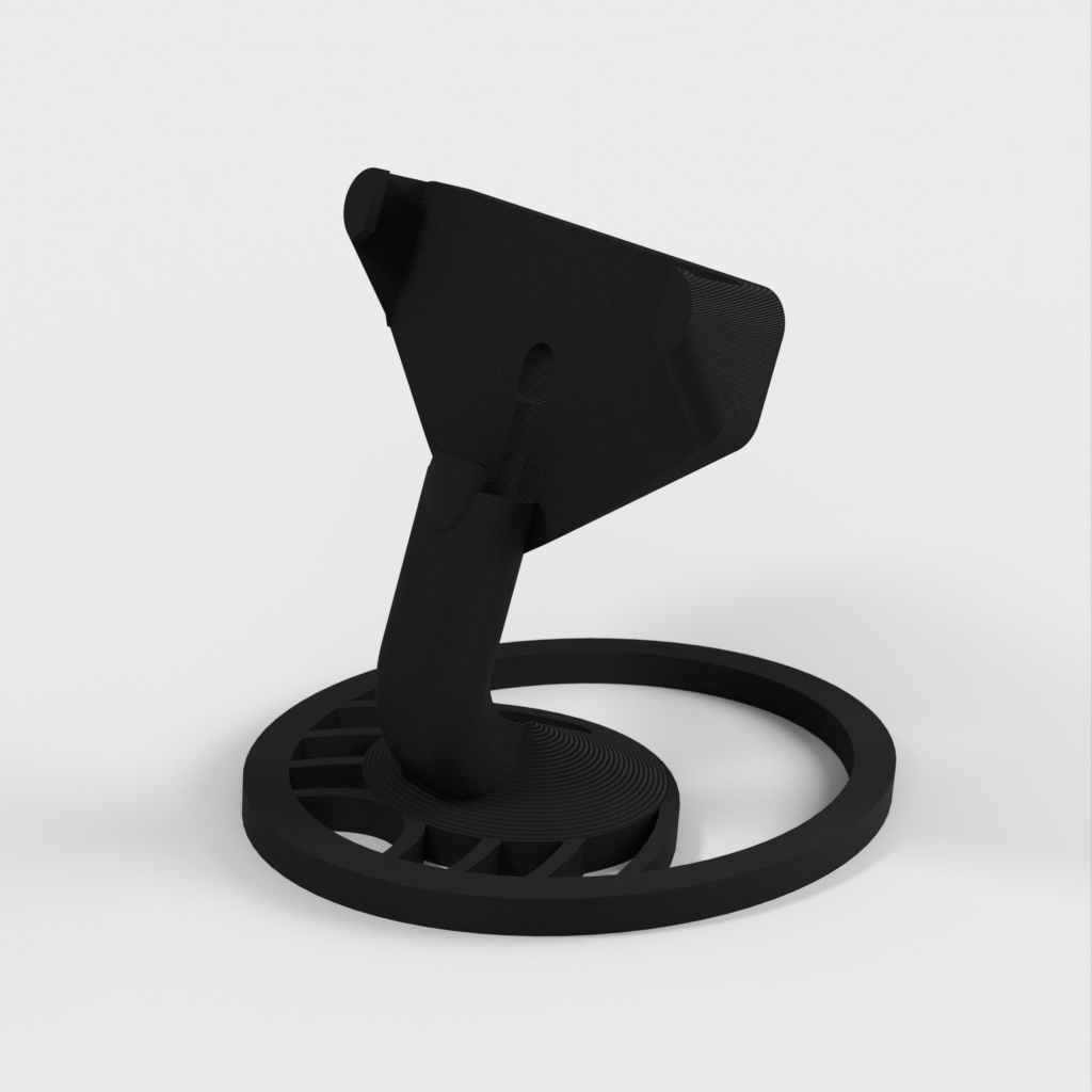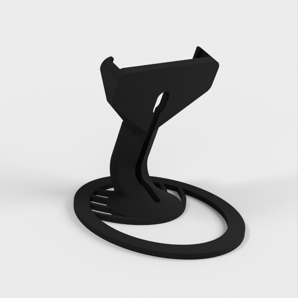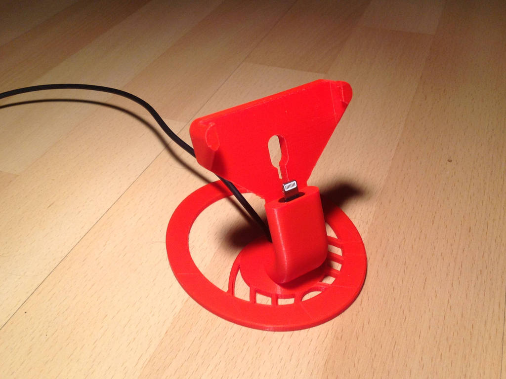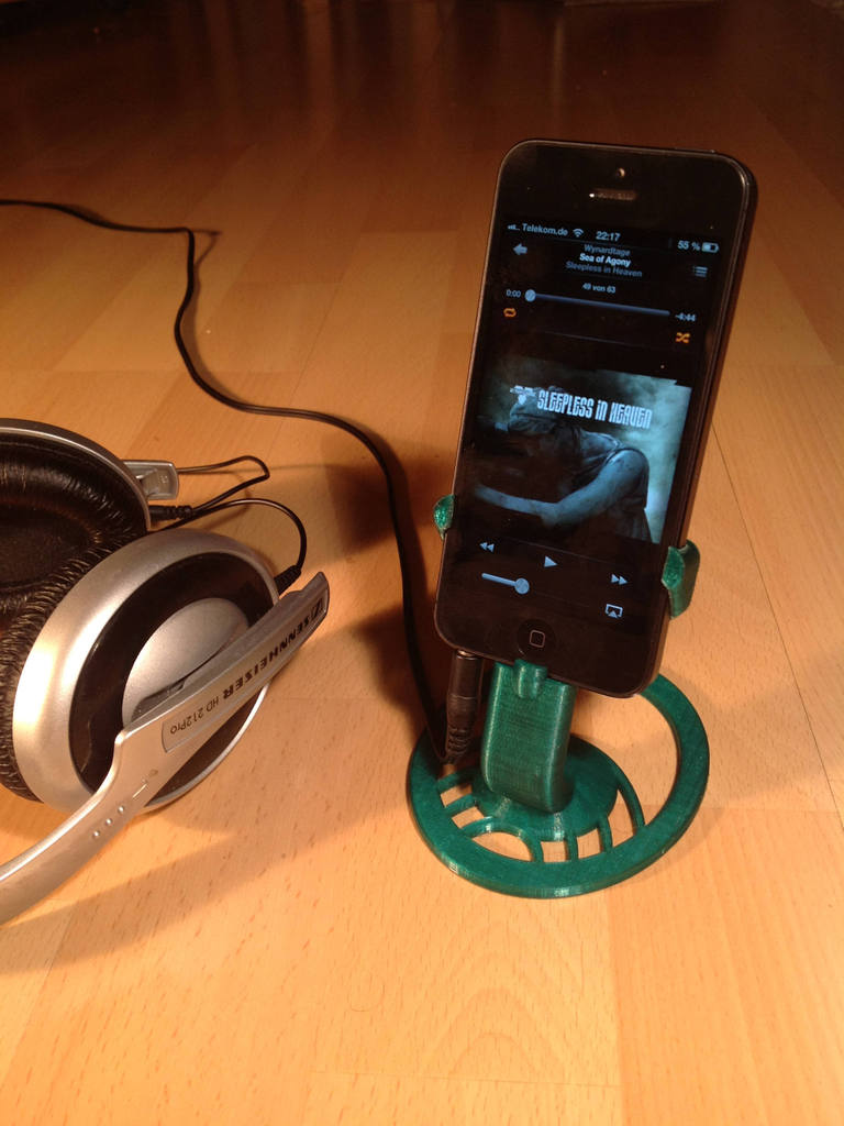 Kaunis jalusta iPhone 5:lle, jossa on tarpeeksi tilaa äänikaapelin liittämiseen.