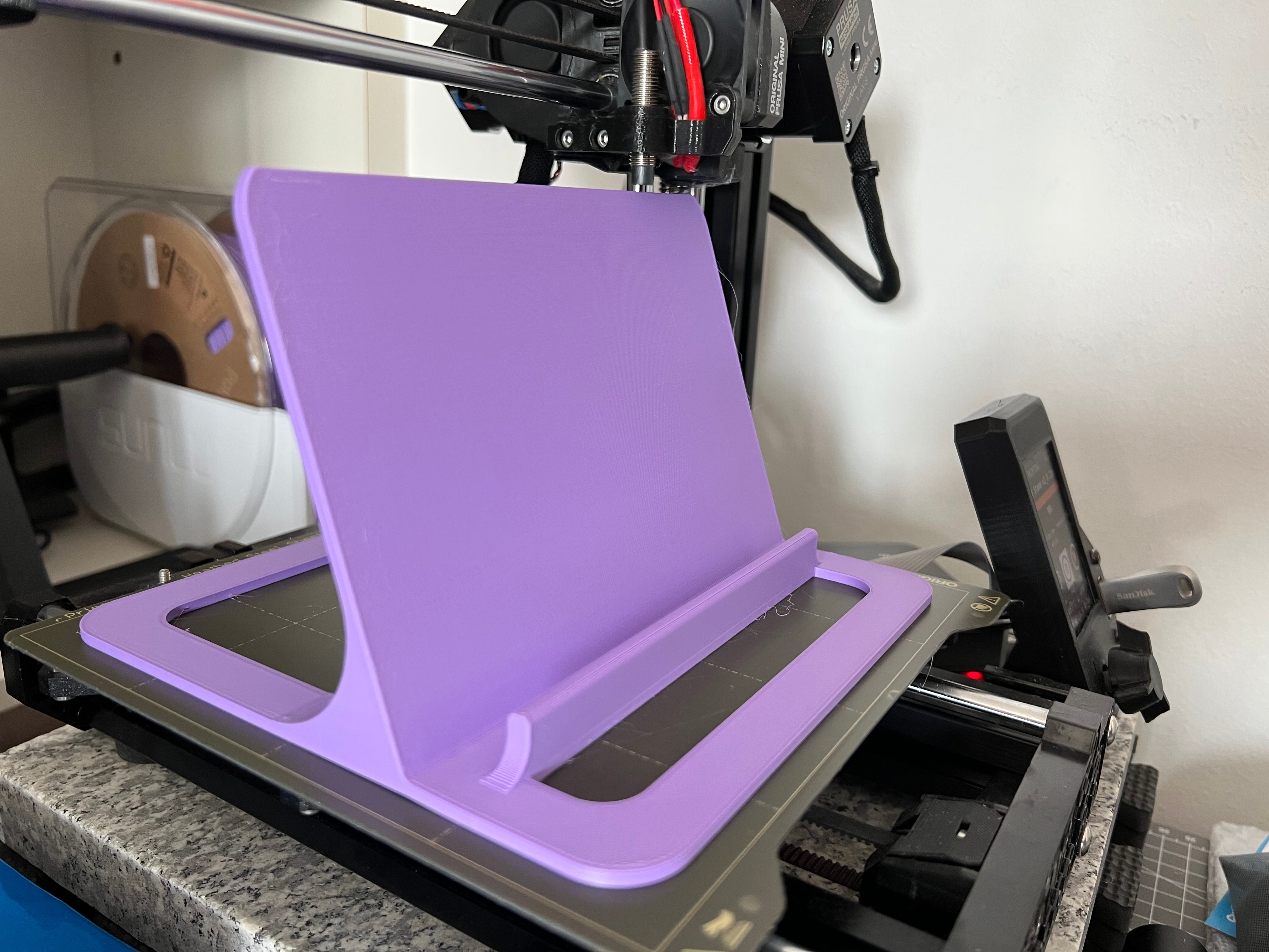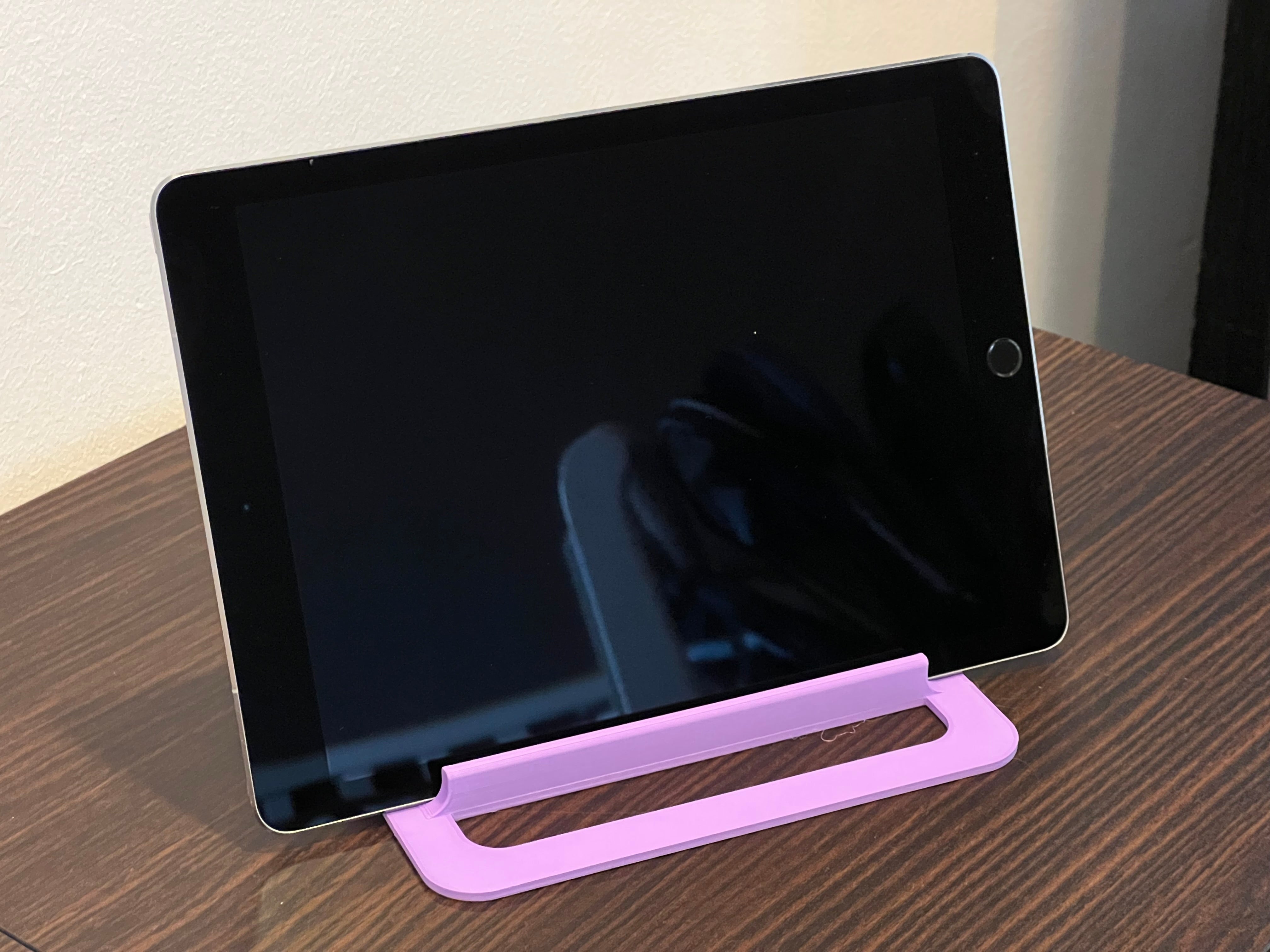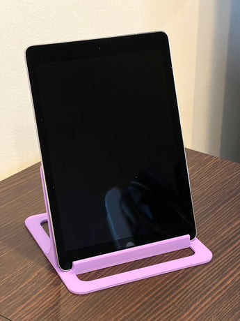 Tämä on yksinkertainen iPad-teline, joka on hieman tavallista suurempi, jotta se pysyy vakaana pehmeämmillä pinnoilla, kuten vuodevaatteilla. Sopii useimpiin iPadeihin koteloiden kanssa ja ilman koteloita. Painettu Polymer PolyTerra Purple -materiaalilla. Fusion360- ja STEP-tiedostot ovat mukana.