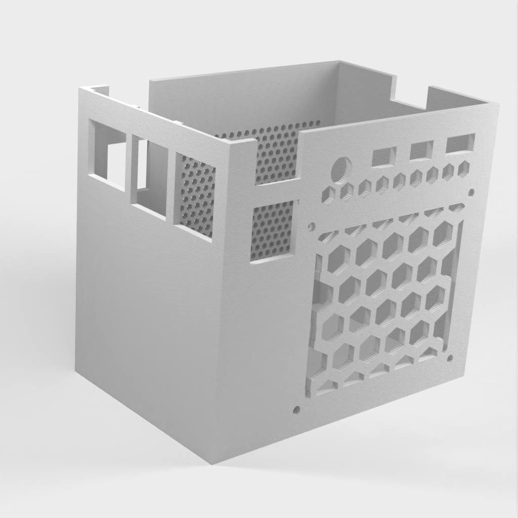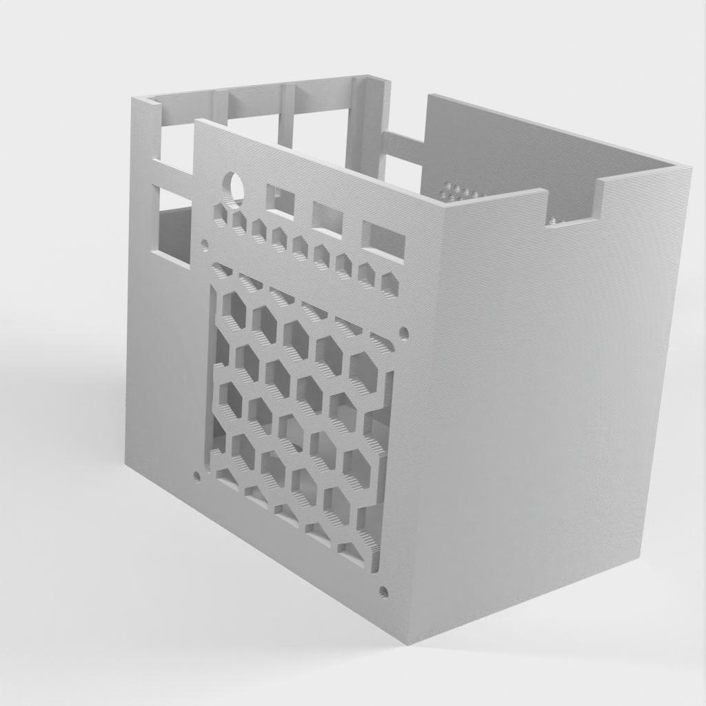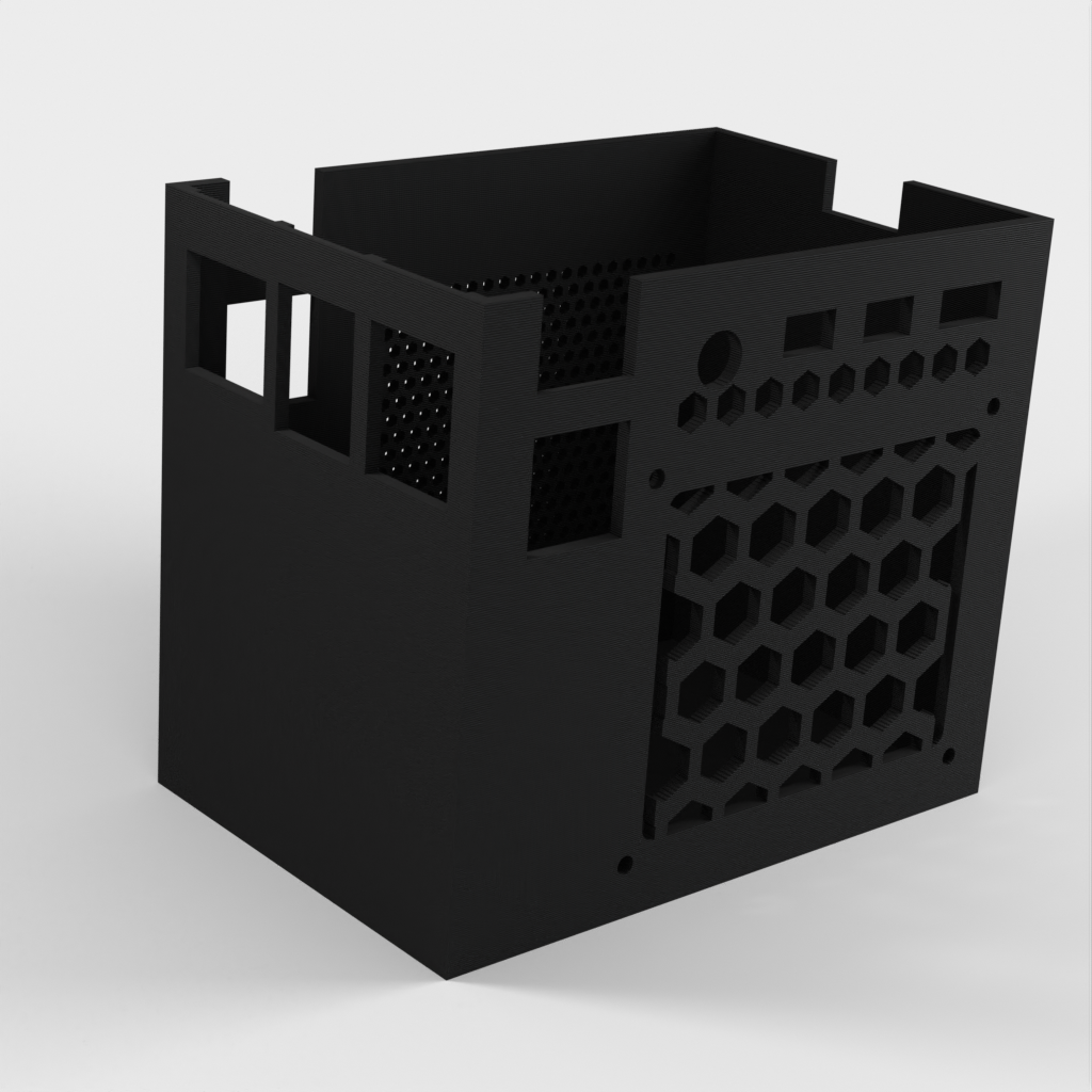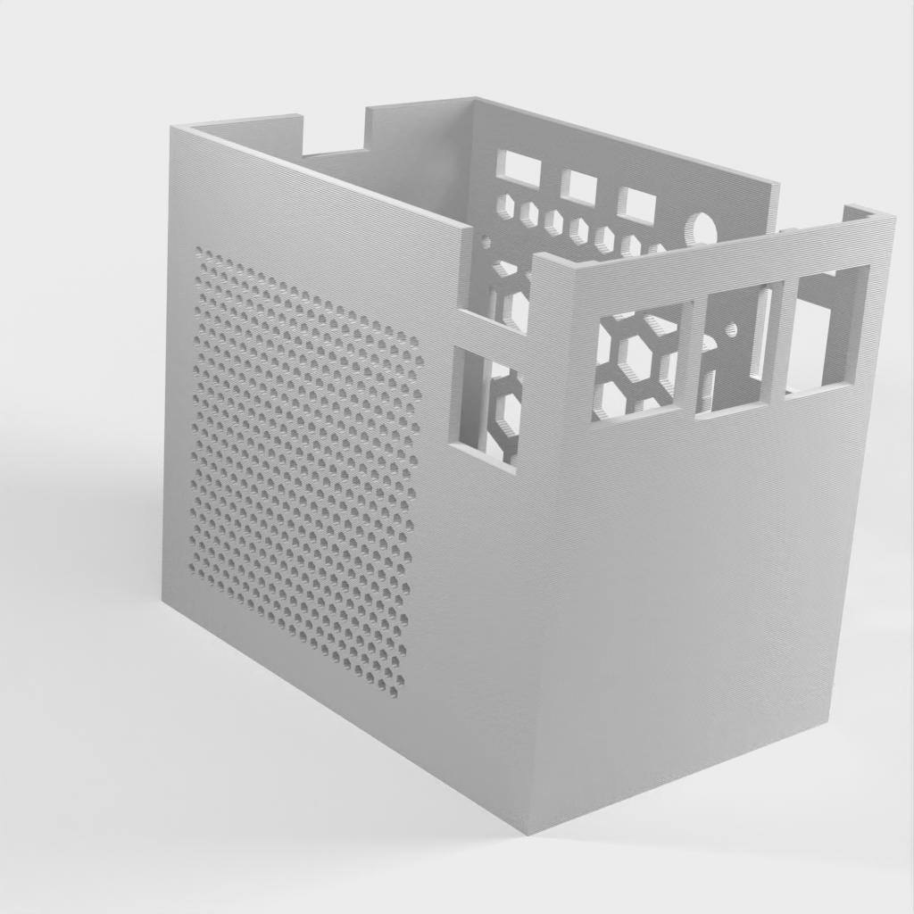 Tämä on minimalistinen kotelo Raspberry Pi 4:lle, joka sopii Ice Tower -jäähdyttimeen. Kotelon yläosan muotoilussa on takana suurempia kuusikulmioita, mikä helpottaa tulostamista. Tulostamisen jälkeen nämä kuusikulmiot voidaan poistaa, jotta kotelo saa kauniimman ilmeen Ice Tower -jäähdyttimen mukana tulevan akryylilevyn avulla, joka on asennettu kotelon kylkeen. Kotelon klipsit ja alaosa on säädetty sopimaan paremmin yhteen ja tukemaan usean halkaisijan kumijalkoja.