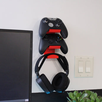 Käytännöllinen seinäteline kahdelle ohjaimelle ja kuulokkeille
