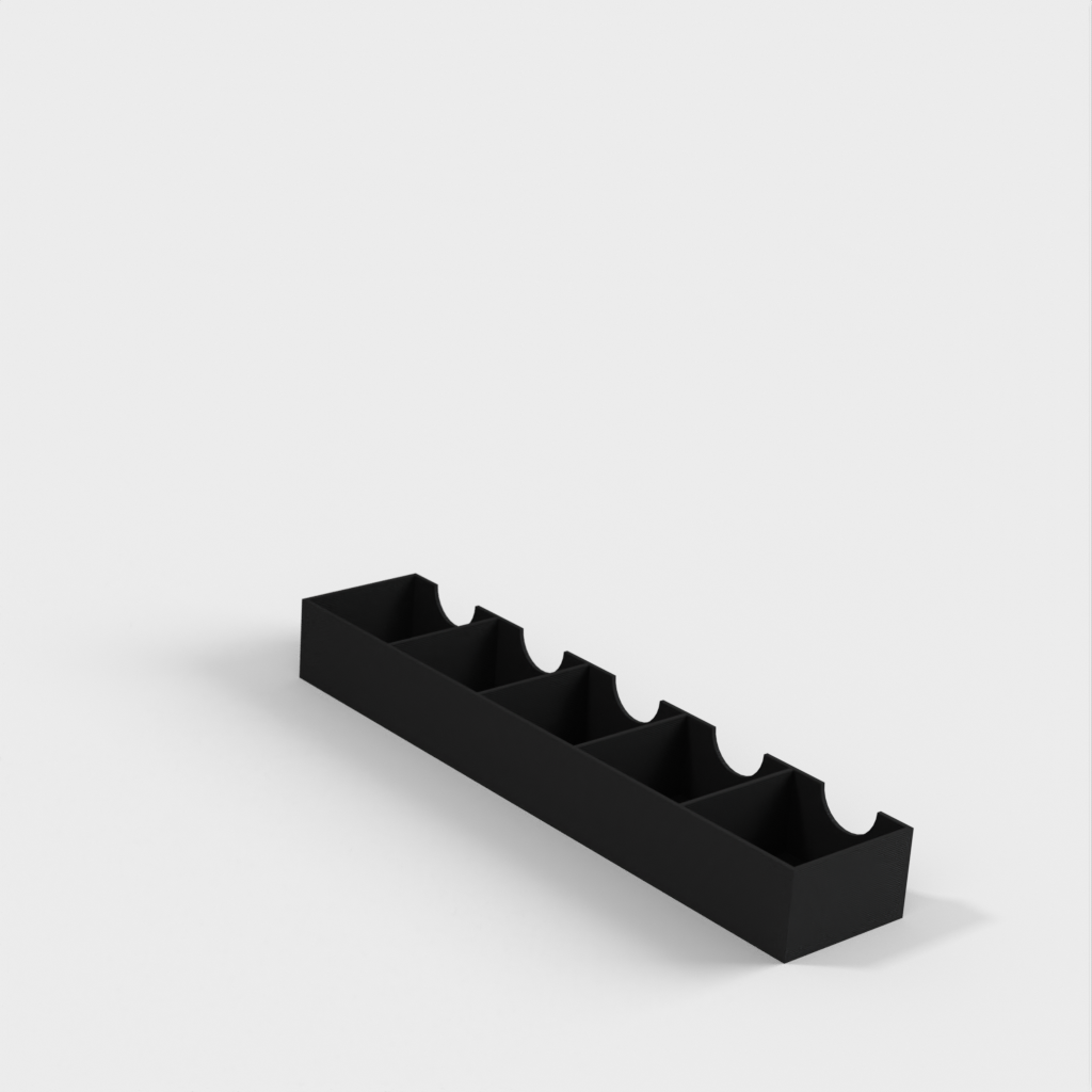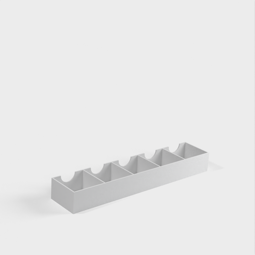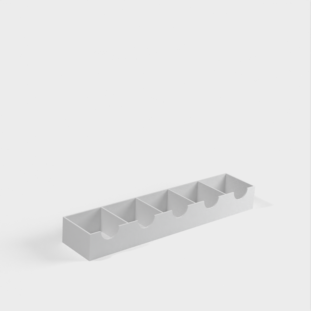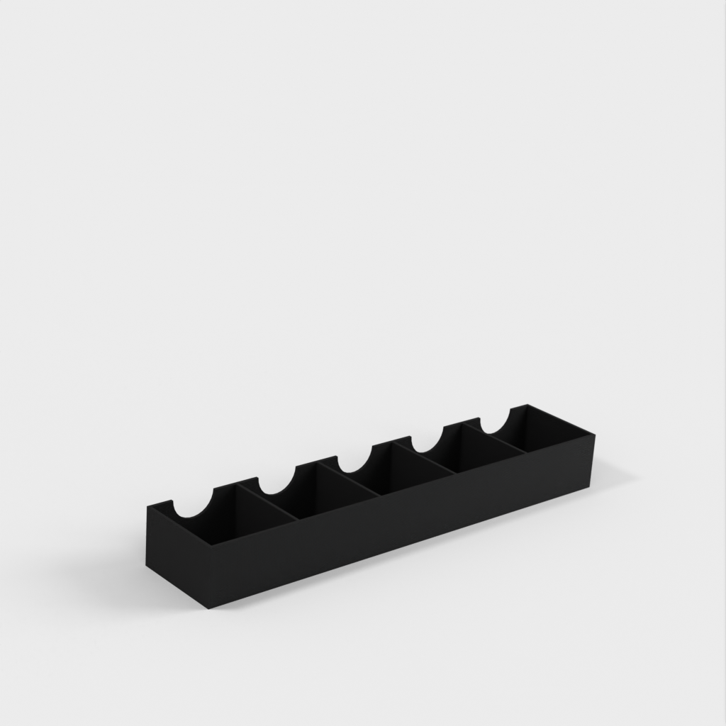 Tämä pidike voidaan helposti kiinnittää kaapin oveen kaksipuolisella teipillä helppoa ja kätevää säilytystä varten. Se voidaan räätälöidä OpenSCAD-ohjelmalla omiin tarpeisiisi sopivaksi, ja siihen mahtuu neliönmuotoisia 45 mm:n pulloja.