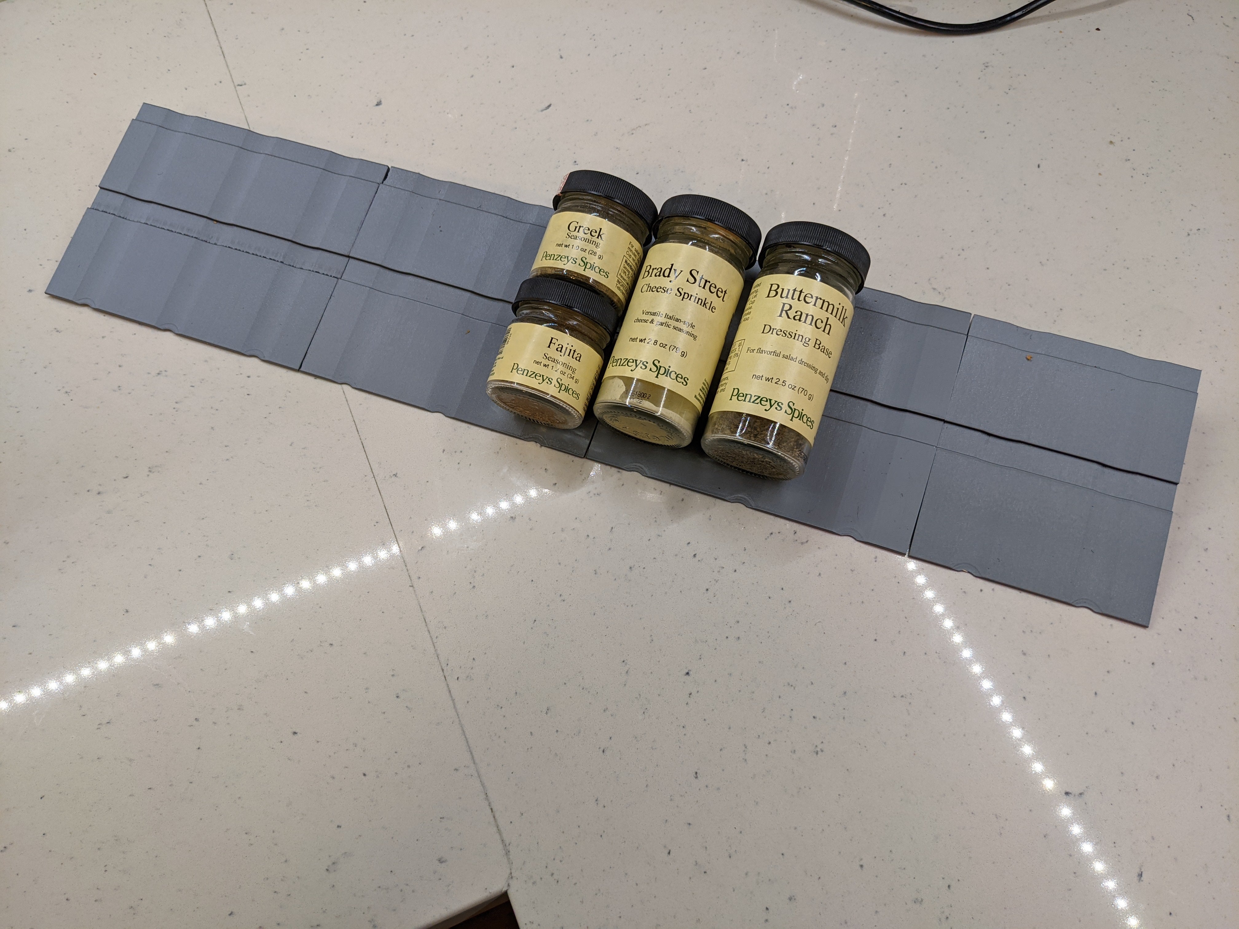 Tämä on Penzysin laatikollinen mausteteline, joka on suunniteltu pitämään joko kahta 1/4 kupin tai yhtä 1/2 kupin Penzys-maustepurkkia. Kappaleiden alaosassa on DIN-kisko, jonka avulla useat tulosteet voidaan yhdistää toisiinsa kiinteällä kehyksellä.