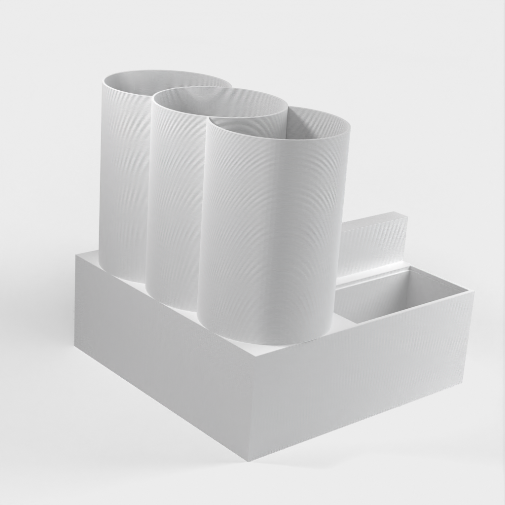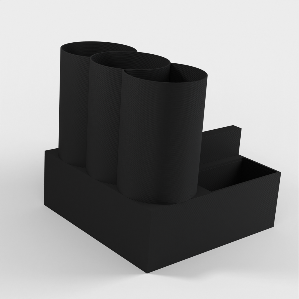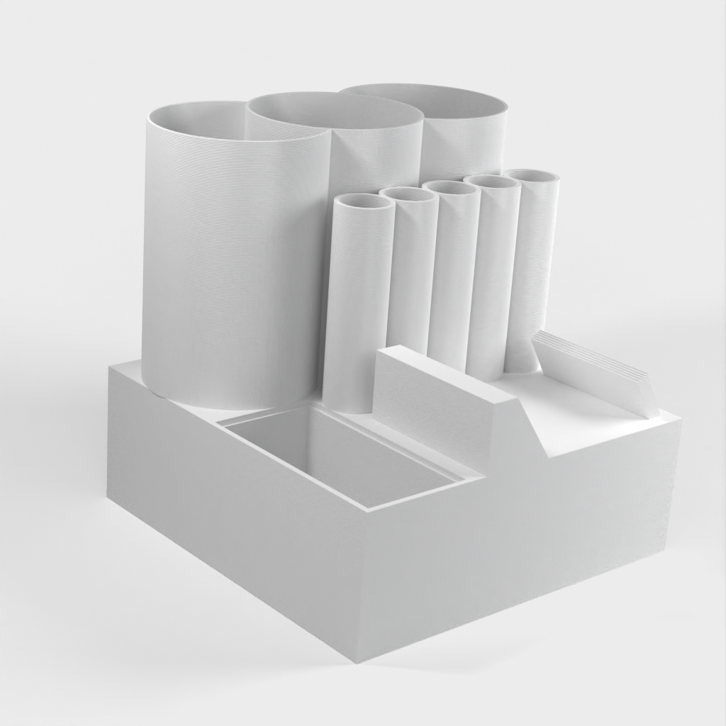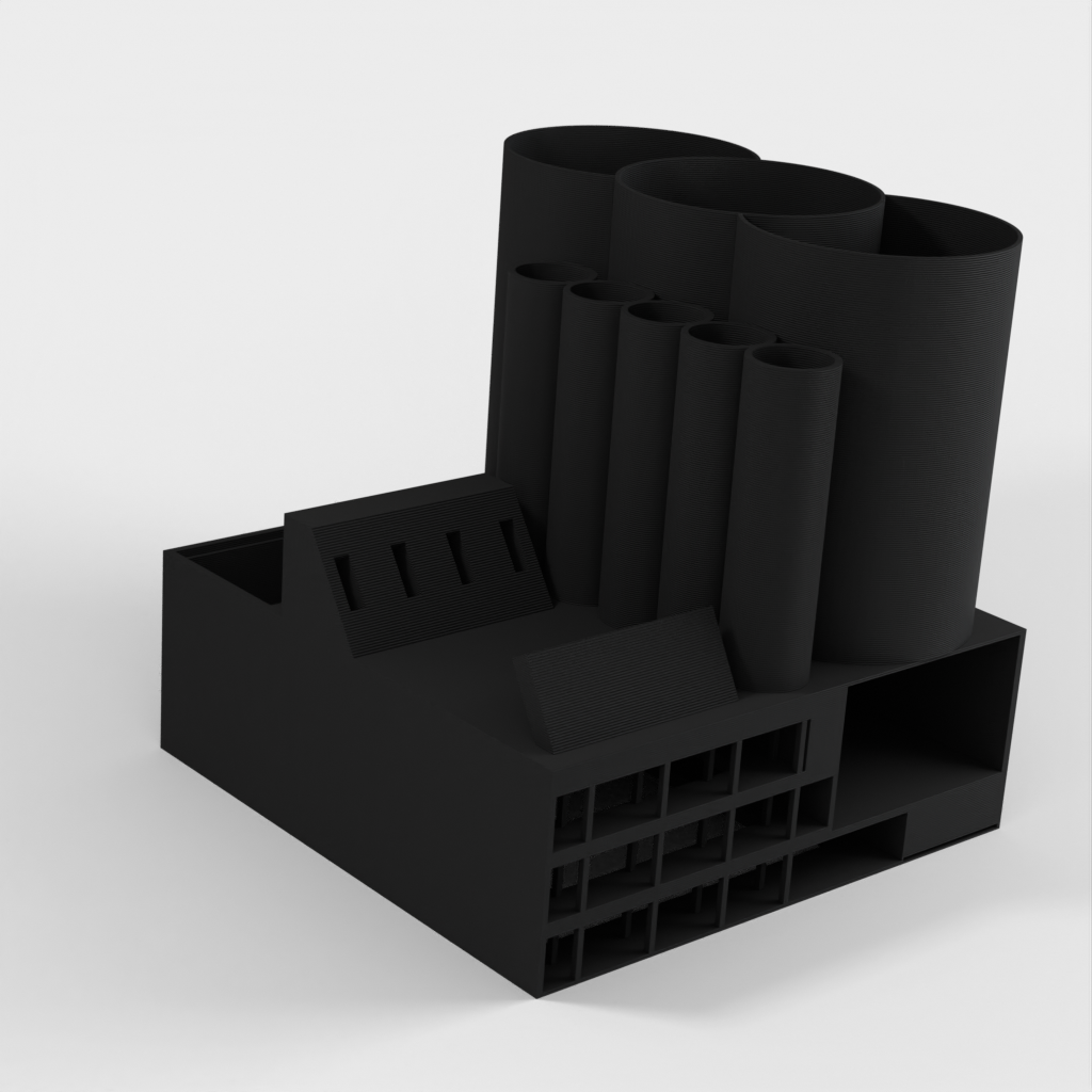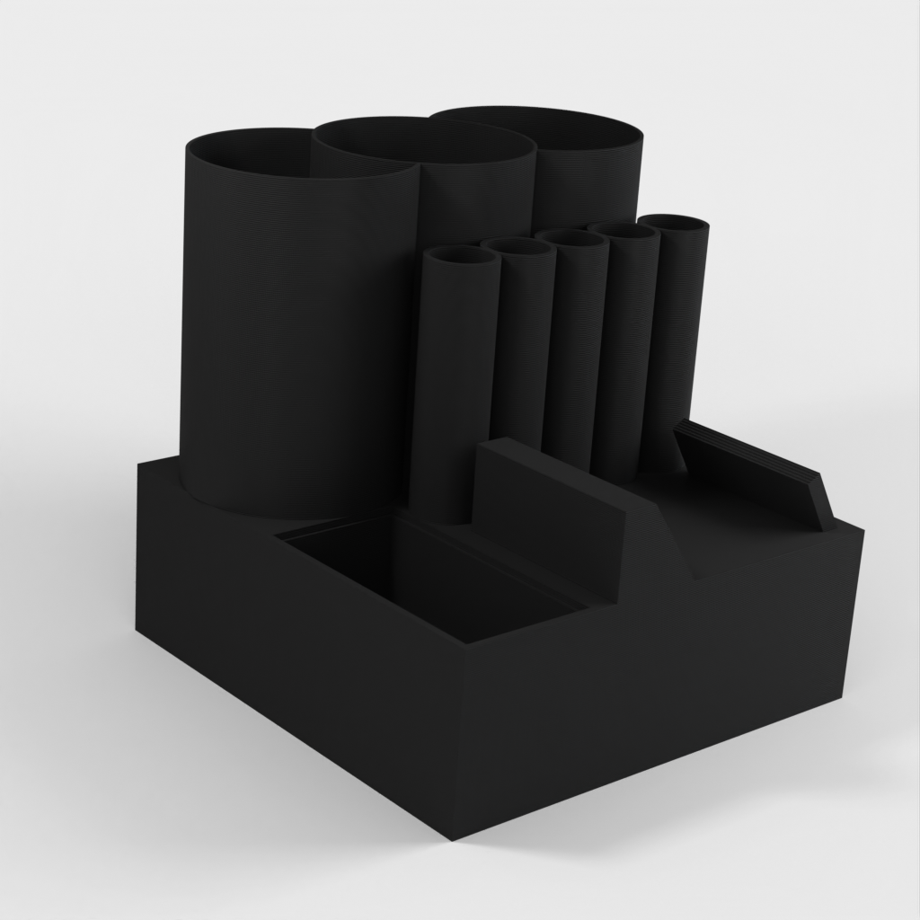 Nimikilpi voidaan integroida, ja siellä on useita suuria ja pieniä säilytyslokeroita kynille, lyijykynille, tusseille tai muille työpöytätarvikkeille. Työpöytäjärjestäjämme avulla varmistat siistin ja hyvin organisoidun työpaikan.