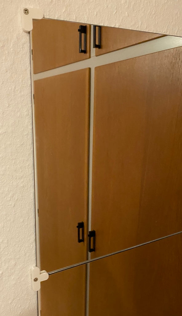 Seinäkiinnikkeet peileille. Sopii 2 mm:n peileille (IKEA LOTS peilit 30x30 cm). Nämä kiinnikkeet on helppo asentaa ja antavat seinällesi puhtaan ja siistin ilmeen.