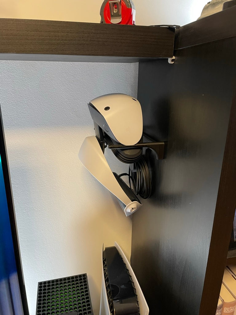 Tämä ripustin on kehitetty tarjoamaan järjestetty ja turvallinen säilytysratkaisu PlayStation VR2 (PSVR2) HMD:lle. Se auttaa pitämään virtuaalitodellisuuskuulokkeet paikallaan, kun niitä ei käytetä, ja suojaa niitä tarpeettomilta iskuilta tai vaurioilta.
