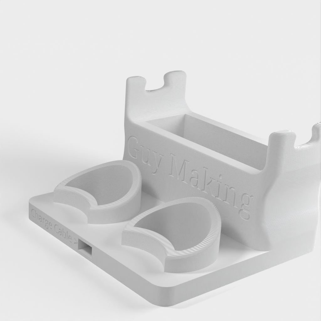 Tämä on Oculus Quest -teline, joka tarjoaa kodin kuulokkeillesi ja ohjaimillesi. Siinä on reikä latauskaapelillesi ja aukko yläosassa erilaisten lisävarusteiden säilyttämistä varten.