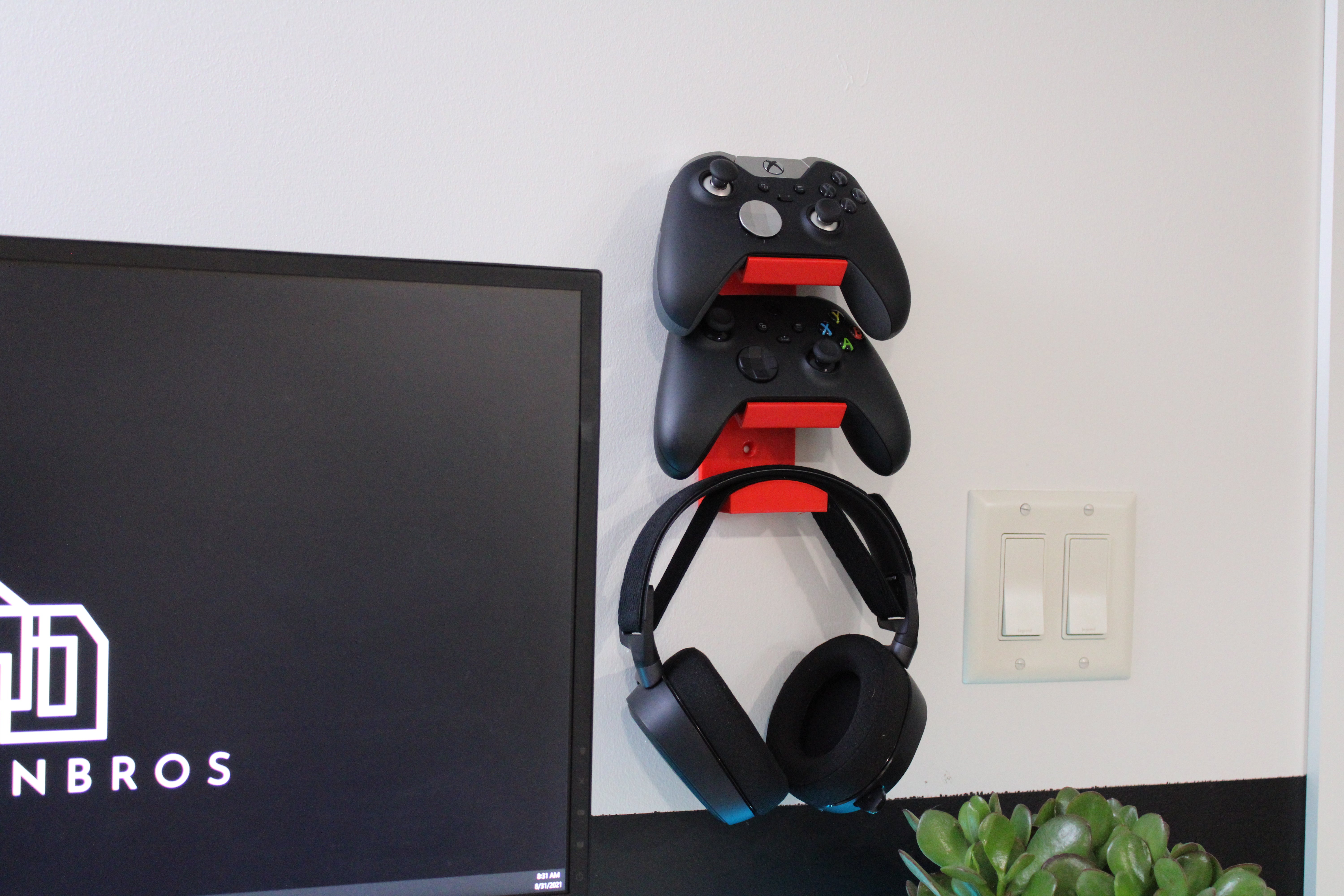 Käytännöllinen seinäteline kahdelle ohjaimelle ja kuulokkeille