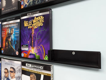 Seinäteline on mitoitettu sopimaan tavallisiin Blu-ray 4K -koteloihin (135 mm x 170 mm x 15 mm), ja samalla se tarjoaa hieman joustavuutta paperiholkeilla varustetuille koteloille. Älykkään lukitusjärjestelmän ansiosta useita yksiköitä voidaan yhdistää, mikä varmistaa, että kotelosi roikkuvat siistissä ja suorassa rivissä ilman vinoutta.