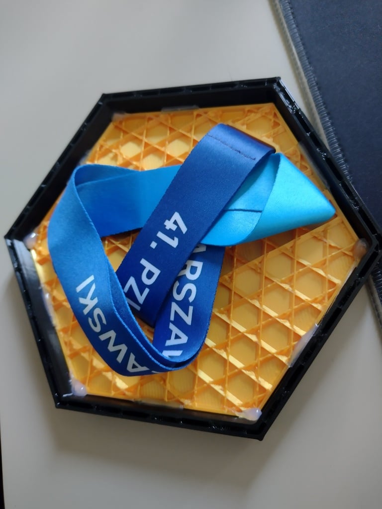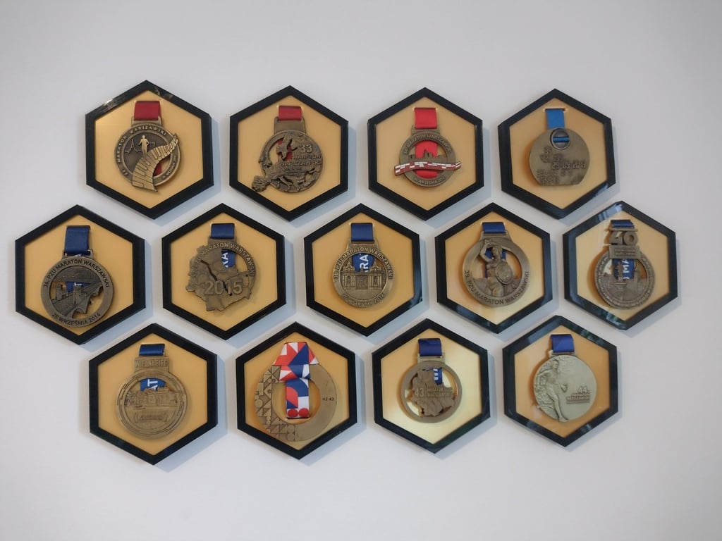 Tämä on kaksiosainen (kaksivärinen) kuusikulmainen mitaliteline/kehys, jolla voit esitellä mitalejasi siististi seinällä. Kuusikulmaisen muodon ansiosta mitalit voidaan järjestää symmetrisesti ja kauniisti.