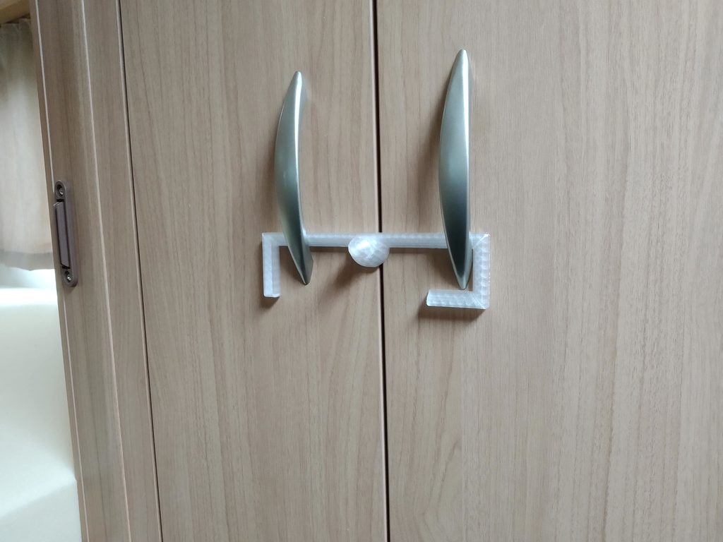 Pieni lukko, joka on suunniteltu pitämään kaapin ovet kiinni asuntovaunun kuljetuksen aikana. Jos asuntovaunusi kaappien ovilla on tapana avautua matkan aikana, tämä voi olla kätevä ratkaisu. Se on yksinkertainen koukku, joka lukittuu molempien ovenkahvojen päälle ja estää niiden avautumisen.