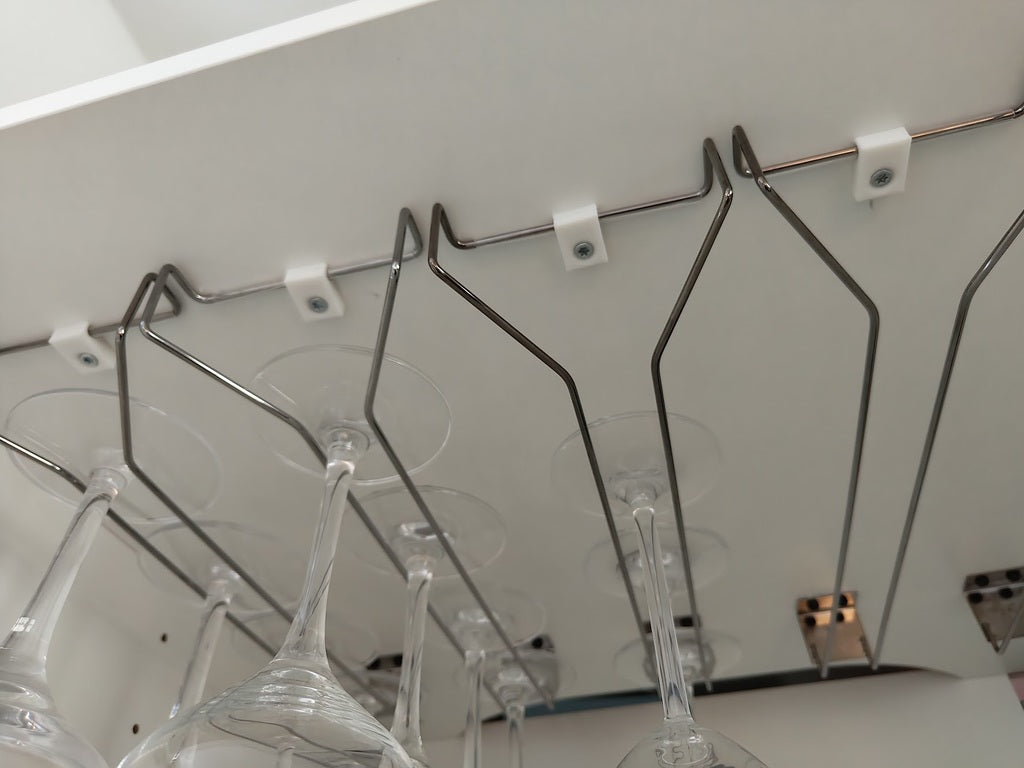 Tämä on pieni kiinnike IKEA Besta -lasipidikkeiden (304.119.53) kiinnittämiseen mille tahansa hyllylle – meidän tapauksessamme IKEA Metod Kitchen Cabinetille. Ruuvina käytetty Spax 3,5x20.