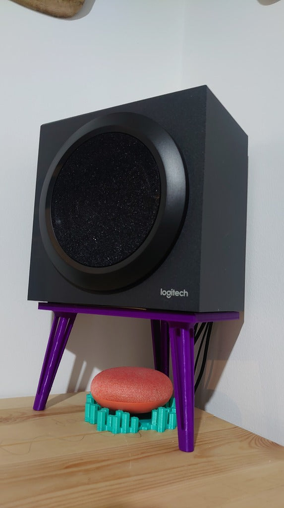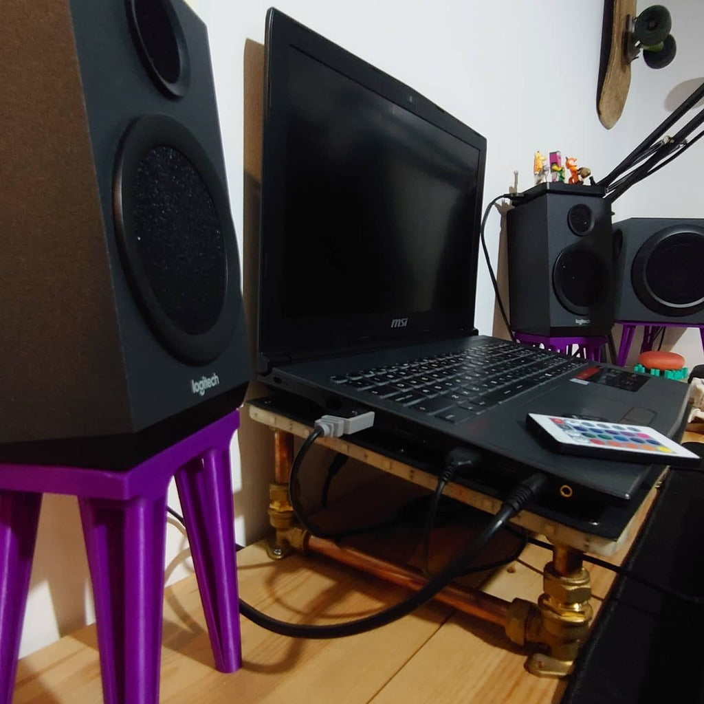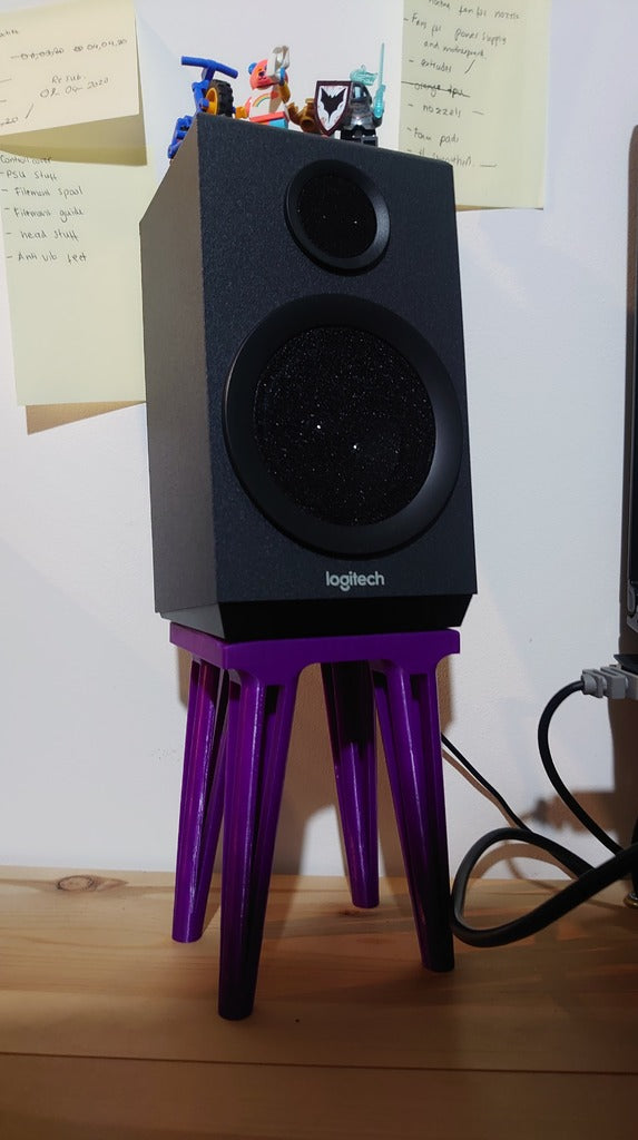 Sarja kaiutintelineitä, jotka on suunniteltu erityisesti ensimmäisessä kuvassa näkyville Logitech-kaiuttimille. Sinun on ehkä tarkistettava pohjan mitat varmistaaksesi, että ne sopivat omiin.