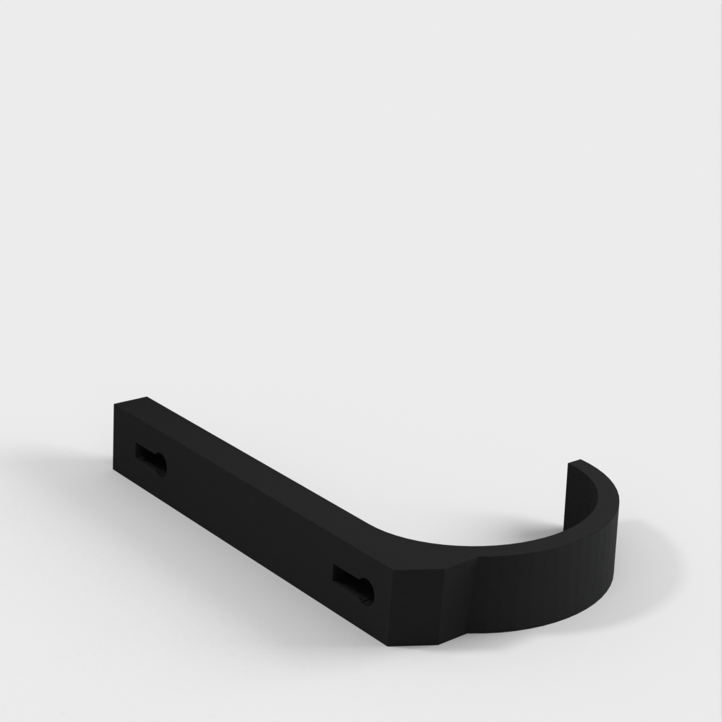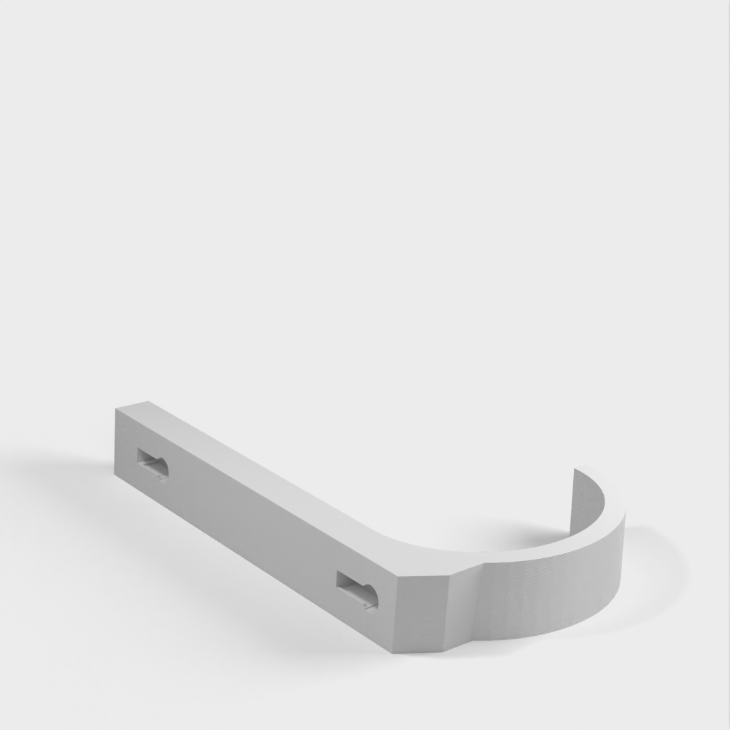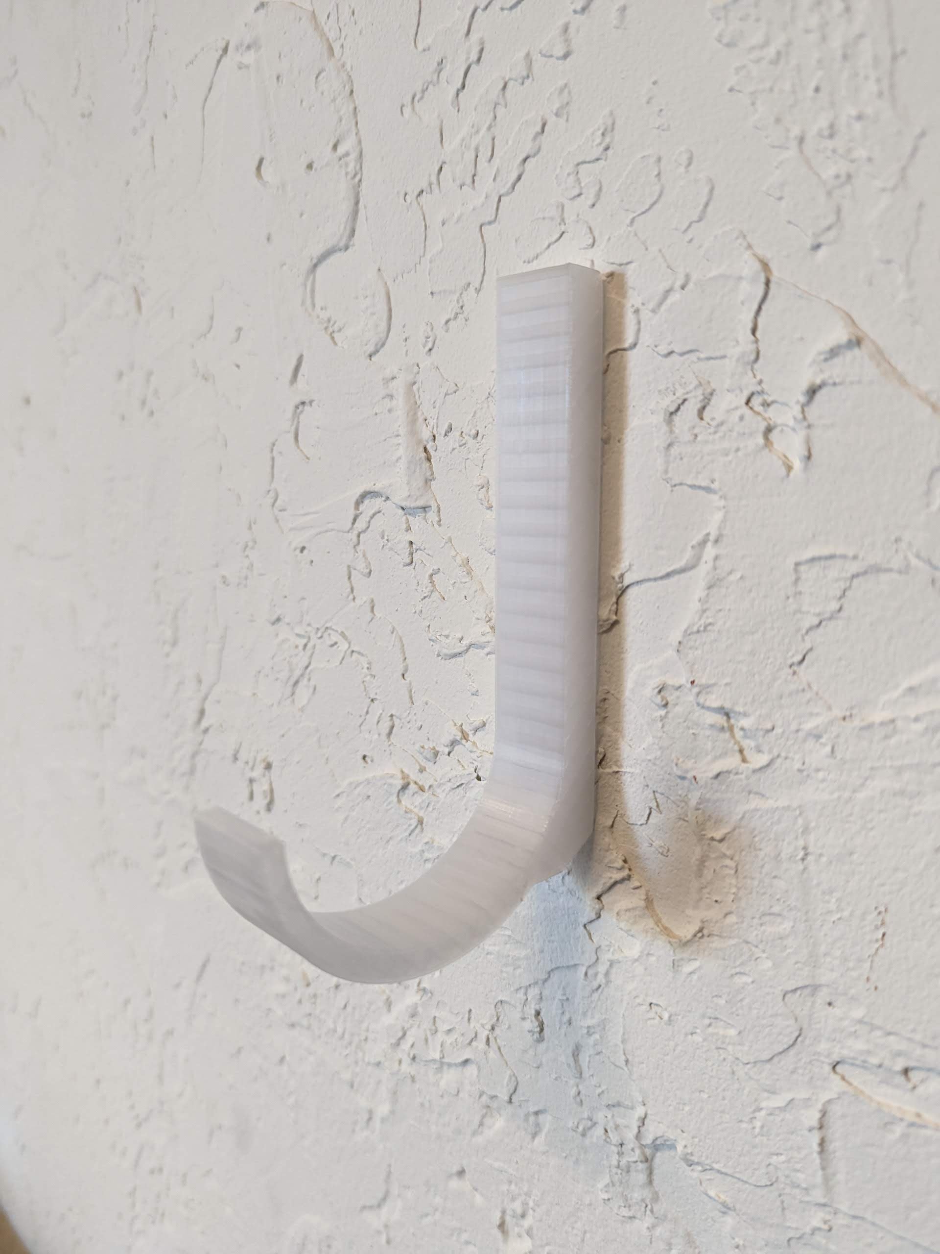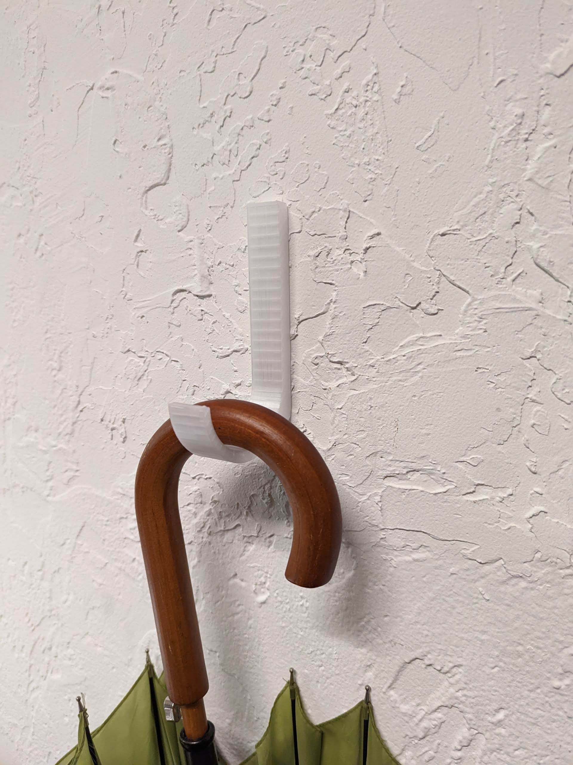 Seinäkoukku esineiden, kuten sateenvarjon, ripustamiseen. Tämä seinäkoukku on painettu PETG:stä ja se on valmis kiinnitettäväksi sisäpuolisilla ruuvinrei'illä.