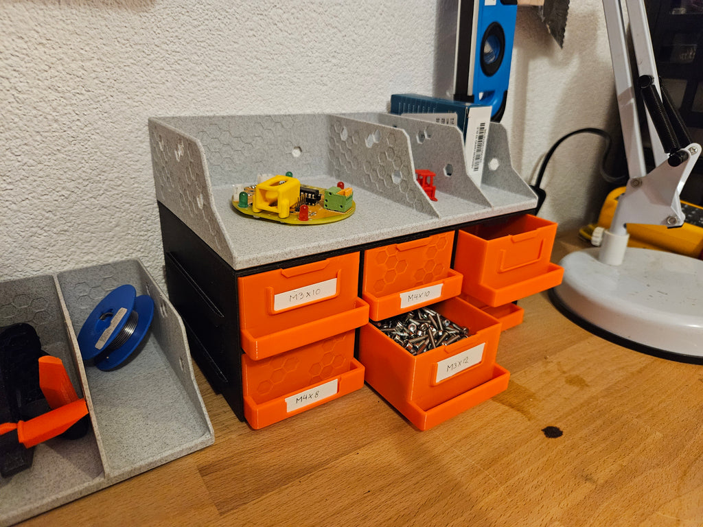 Tämä modulaarinen vetolaatikosto on suunniteltu tuomaan järjestystä ja tehokkuutta työpajaasi, harrastushuoneeseesi tai mihin tahansa muuhun tilaan, jossa pienet osat ja työkalut on pidettävä järjestyksessä. Järjestelmä koostuu pinottavista hyllyistä ja vetolaatikoista, joissa on joustavat tilanjakajat, joiden avulla voit mukauttaa säilytystilan juuri omien tarpeidesi mukaan. Tarvitsitpa sitten ruuveja, elektronisia komponentteja, askartelutarvikkeita tai jopa sähköruuvimeisselin ja sen teriä, tämä kaappi tarjoaa käytännöllisen ratkaisun. Laatikoissa on älykäs liukuestejärjestelmä, joka estää niitä putoamasta ulos, kun siirrät hyllyjä. Lisämukavuuden vuoksi voit käyttää integroituja merkintäkenttiä joko paperitarroille tai 3D-tulostetuille etiketeille, jotta voit nopeasti tunnistaa sisällön. Erilaisten hyllykokoonpanojen, mukaan lukien 3x4, 3x3 ja 3x2 laatikot, avulla voit luoda räätälöidyn säilytysratkaisun, joka maksimoi tilankäyttösi. Tämä on ihanteellinen järjestelyratkaisu niille, jotka etsivät jäsenneltyä ympäristöä, jossa kaikella on paikkansa.