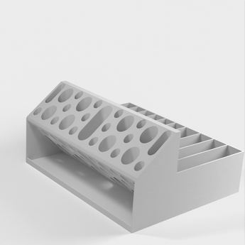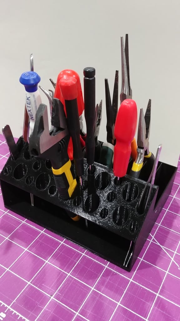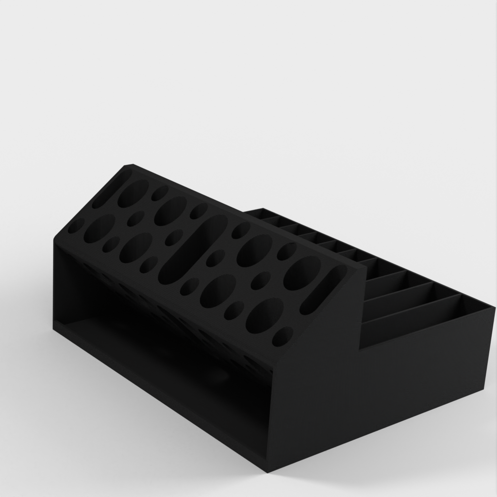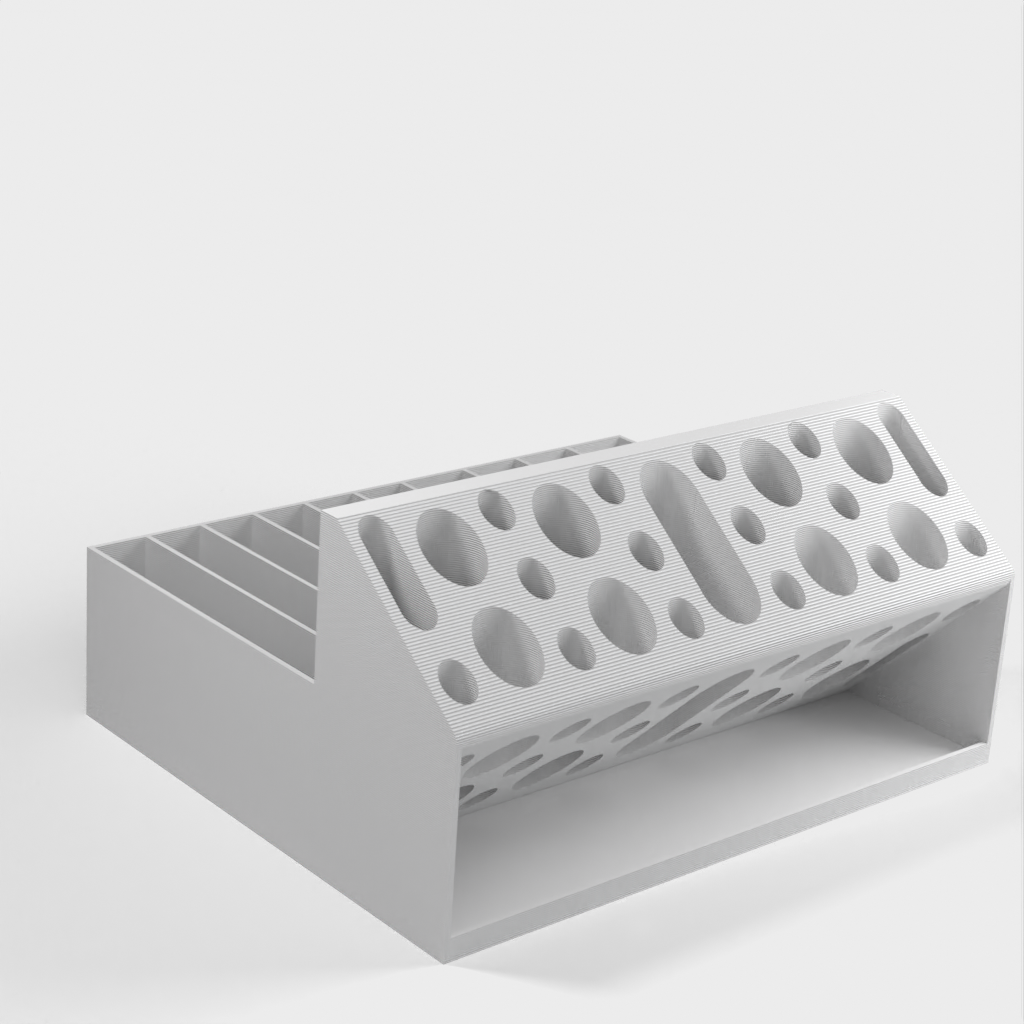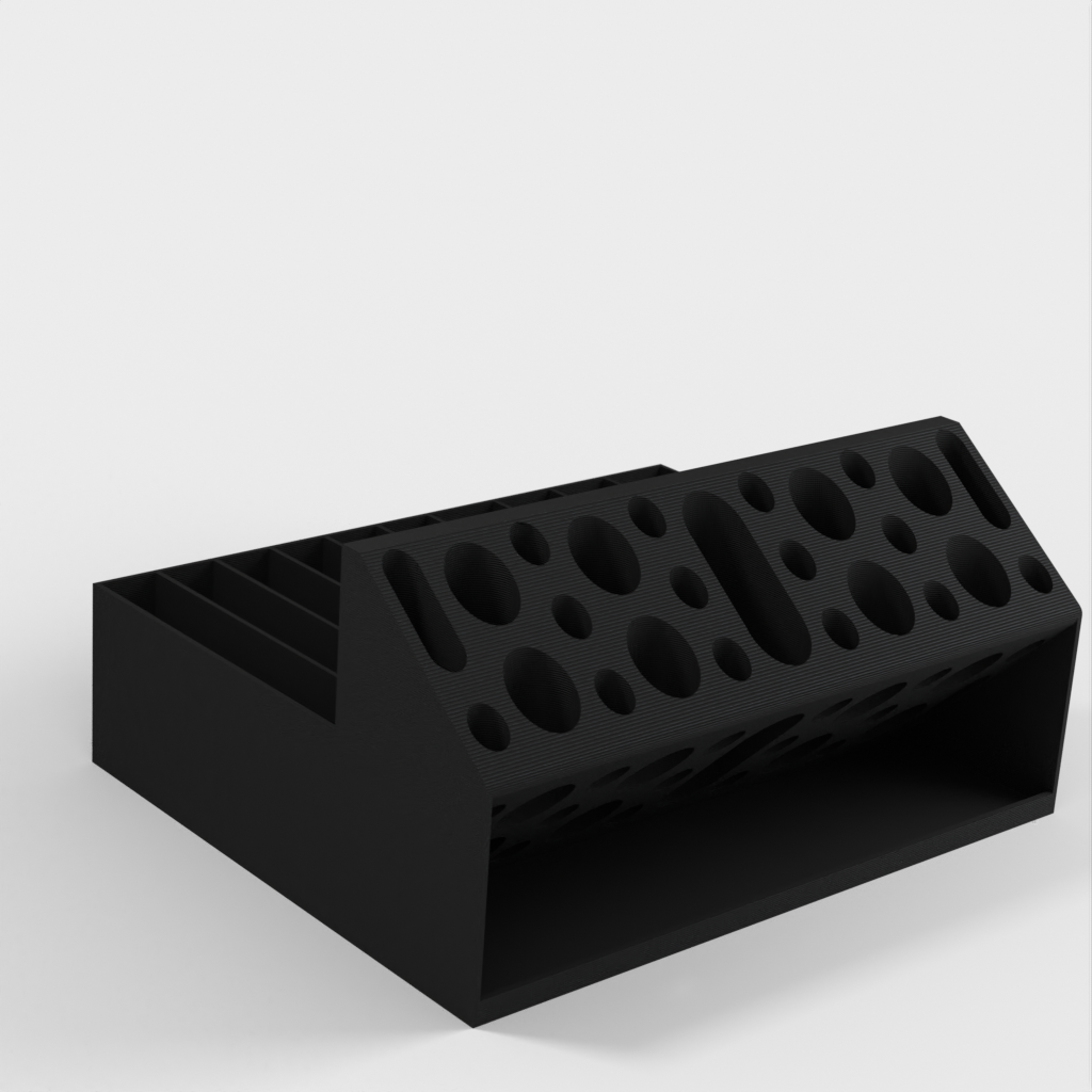 Tämä Pliers Holder Remix on suunniteltu järjestämään työkalukokoelmasi helpommin. Siinä on suuremmat soikeat reiät, joihin mahtuu puoliavain ja leveämmät aukot paksumpia pihtien kahvoja varten. Pyöreän reikäosan alaosaan on lisätty huuli, joka estää pienempien esineiden liukumisen pois/läpi. Täydellinen 3D-tulostimille, harrastajille, työpöydän organisointiin ja työpajan säilytykseen.