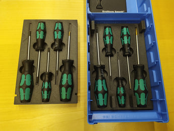 Tämä pinottava alusta on suunniteltu järjestämään ruuvimeisselisi tehokkaasti. Se on erityisesti mukautettu WERA-kahvojen ja terän pituuksien kolmeen pääkokoon. Jokaiseen alustaan mahtuu 2 suurta (terä 100 mm, kahva 98 mm), 2 keskikokoista (terä 80 mm, kahva 81 mm) ja 1 pieni ruuvimeisseli (terä 60 mm, kahva 70 mm).