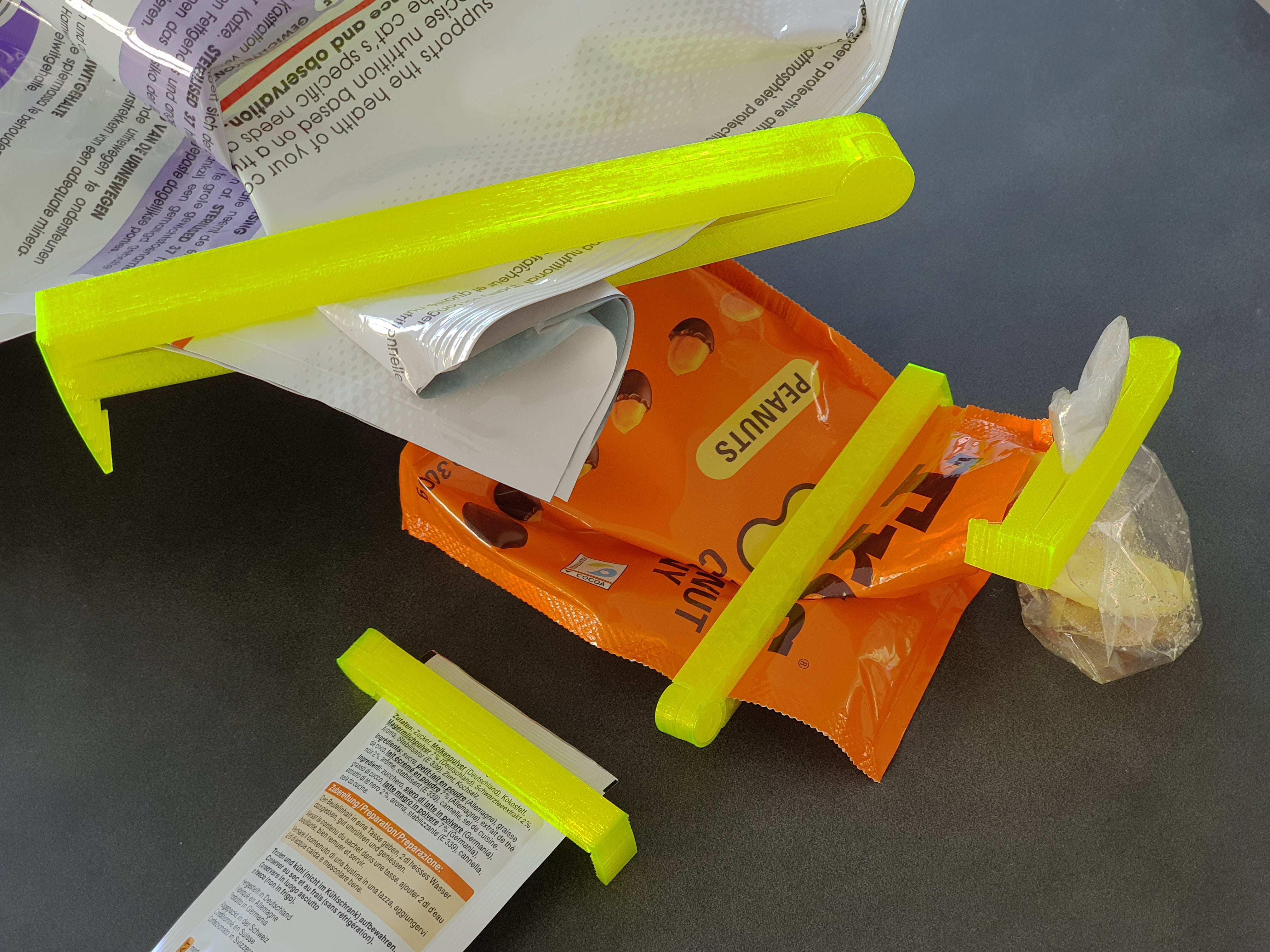 Käytännöllinen laukkuklipsi, jossa on salpamekanismi ja joka voidaan tulostaa suoraan ilman tukea. Tämä klipsi sopii täydellisesti pitämään laukut suljettuina ja raikkaina. Mukana tulevan OpenSCAD-tiedoston avulla voit helposti säätää kokoa tarpeisiisi sopivaksi.