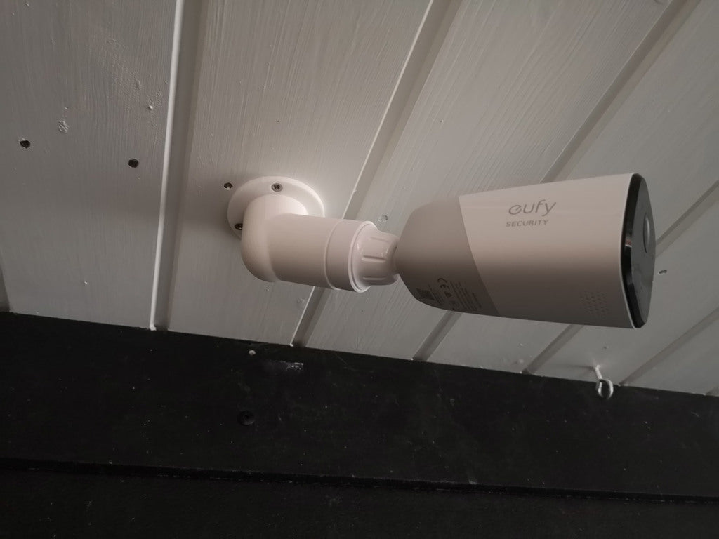Arlo/Eufy-turvakamerakiinnike kulmalla katon alle ripustamista varten. Tämä tukeva kulmaratkaisu sopii täydellisesti Eufyn ja Arlon mukana toimitettavan ruuvikiinnikkeen kanssa.