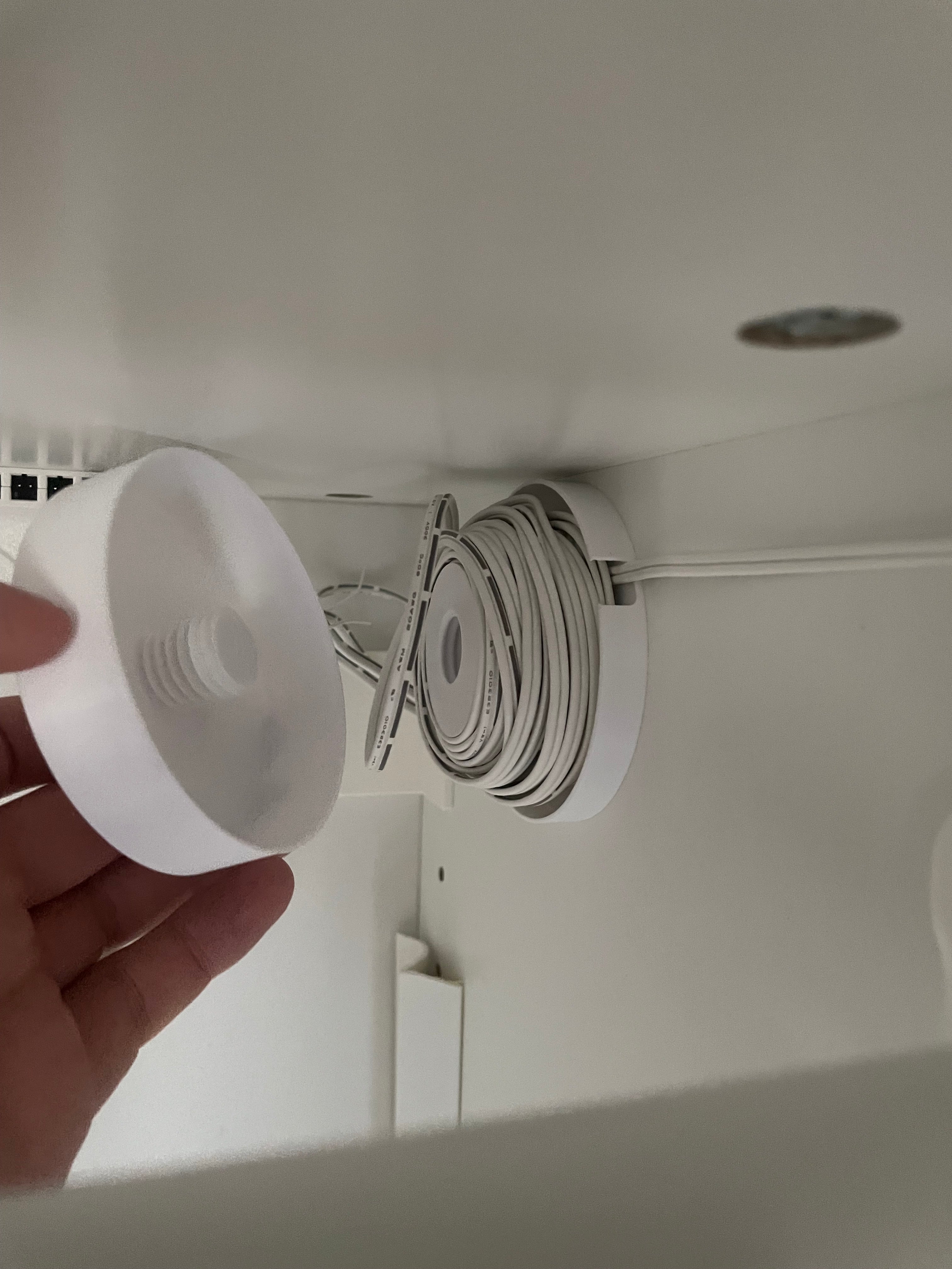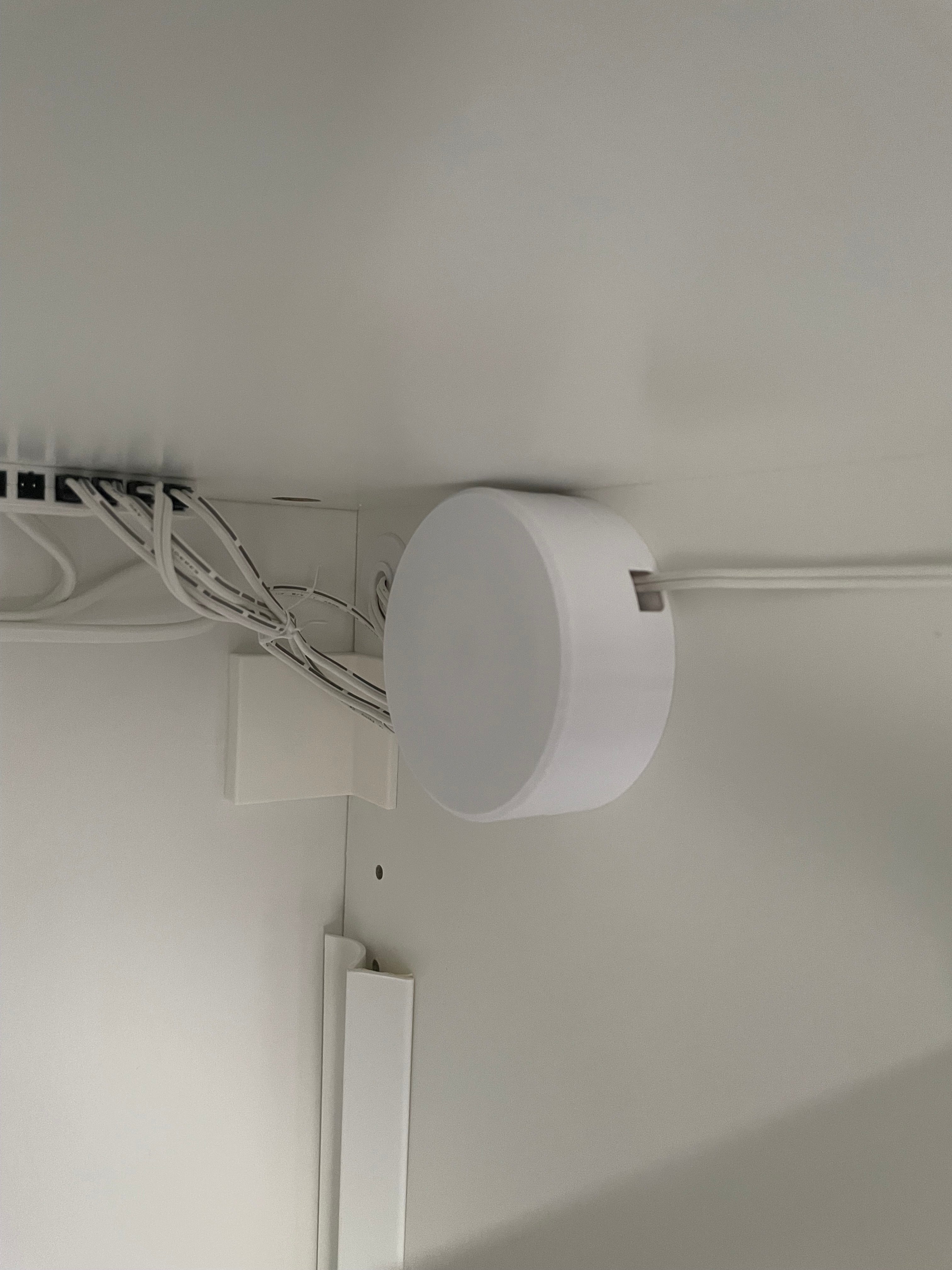 Pyöreä kaapelinjärjestäjä pysyvään asennukseen. Tässä tuotteessa on reikä pohjan keskellä, joten se voidaan kiinnittää seinään.