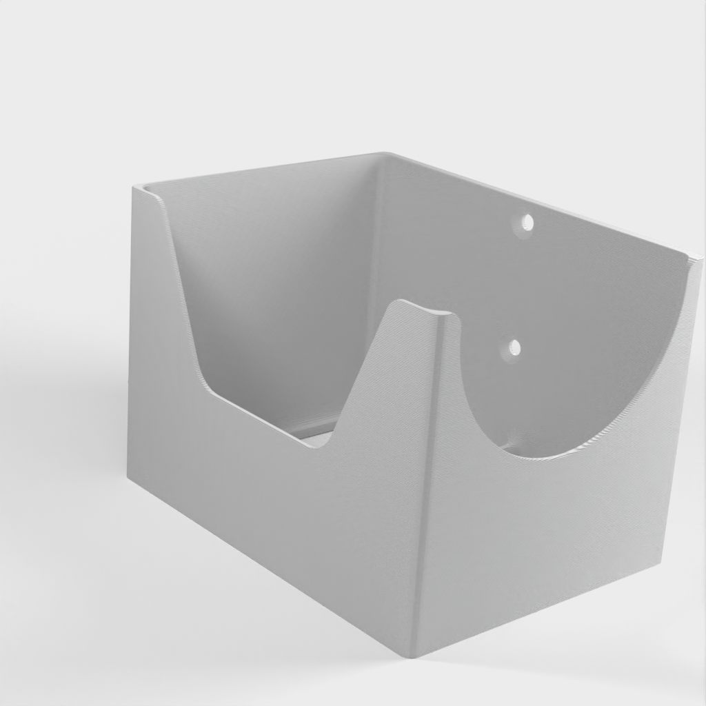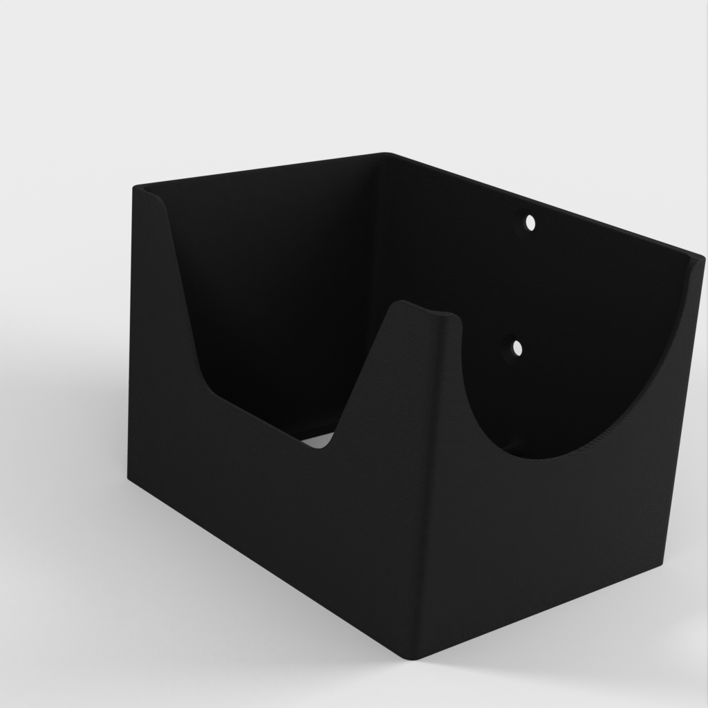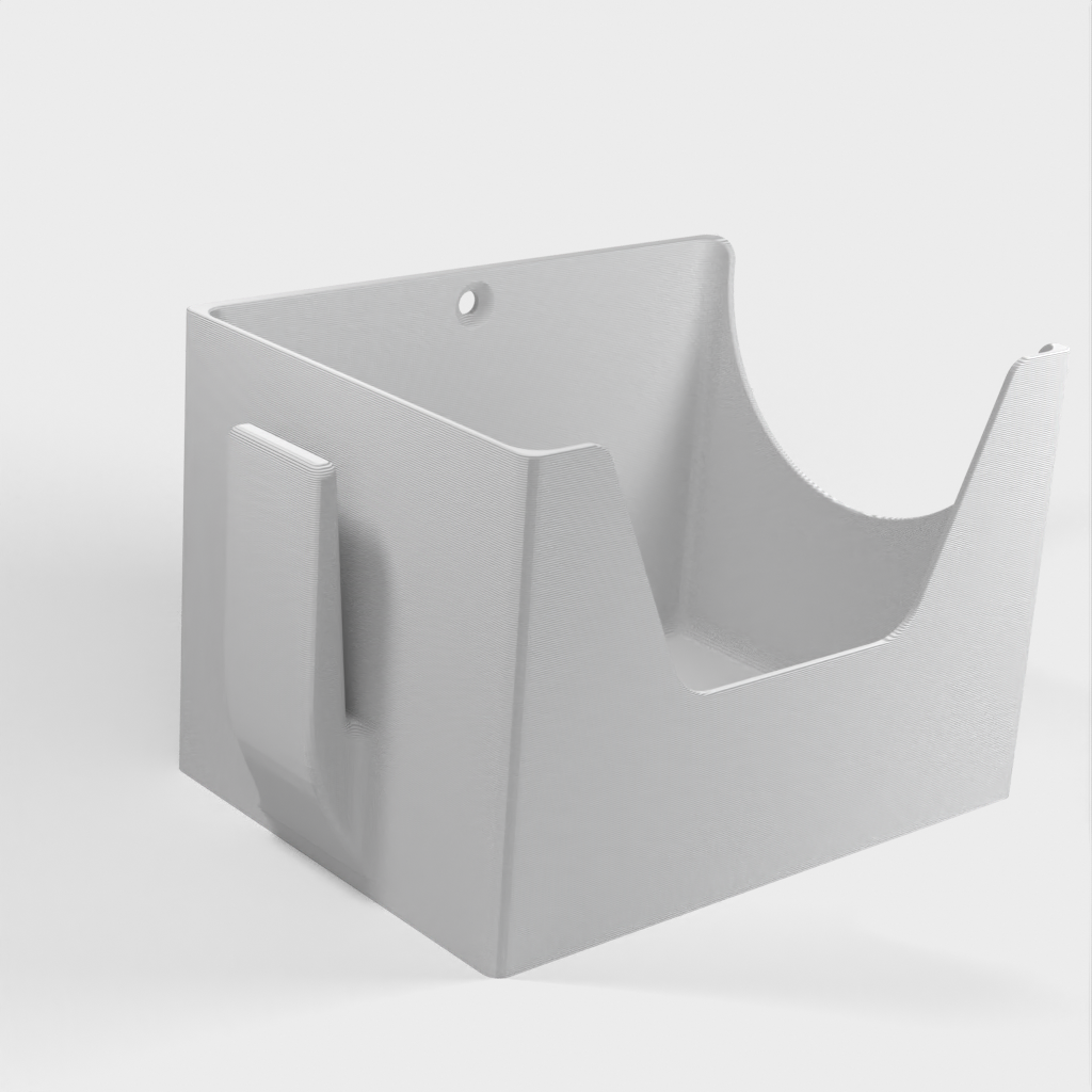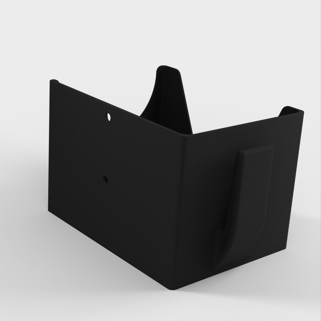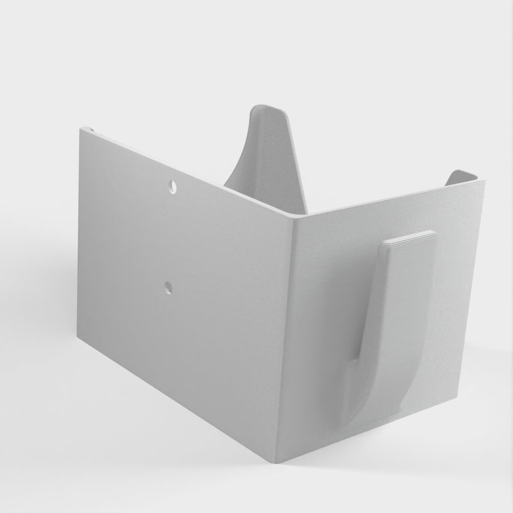 Kiinnike voidaan kiinnittää seinään yhdellä tai kahdella ruuvilla, ja se sisältää varakiristyskoukun kaulahihnalle siltä varalta, että se lipsahtaa kädestäsi, kun laitat sen kiinnikkeeseen tai otat sen pois kiinnikkeestä.
