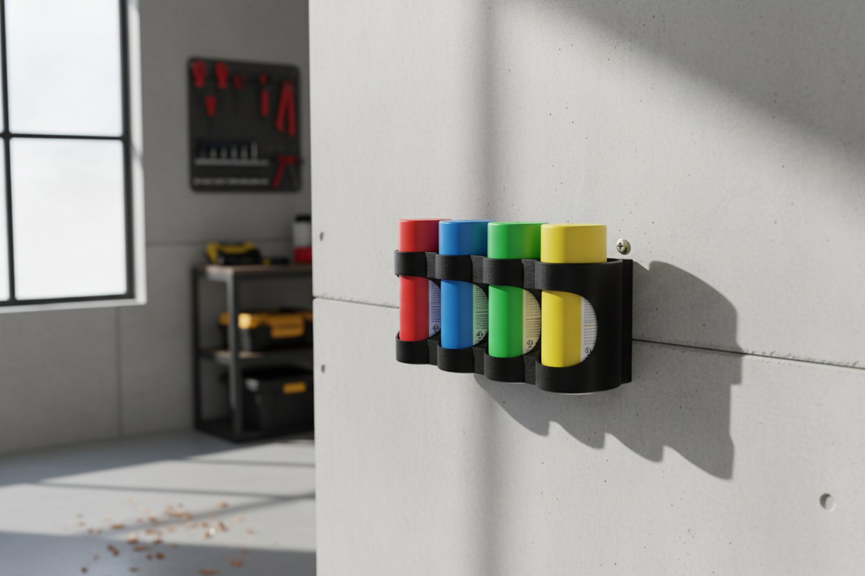 Suihkepulloteline, johon mahtuu 4 jopa 70 mm leveää pulloa. Tämä teline luo järjestystä työpajaan, vajaan tai työajoneuvoon.