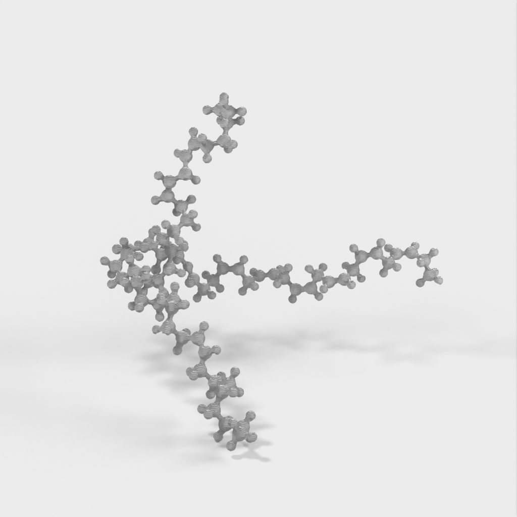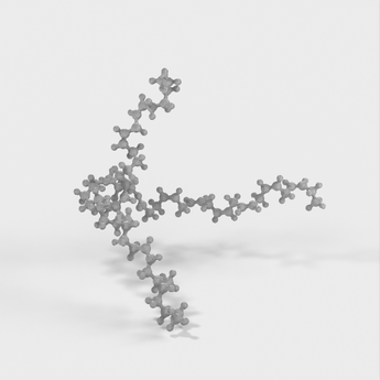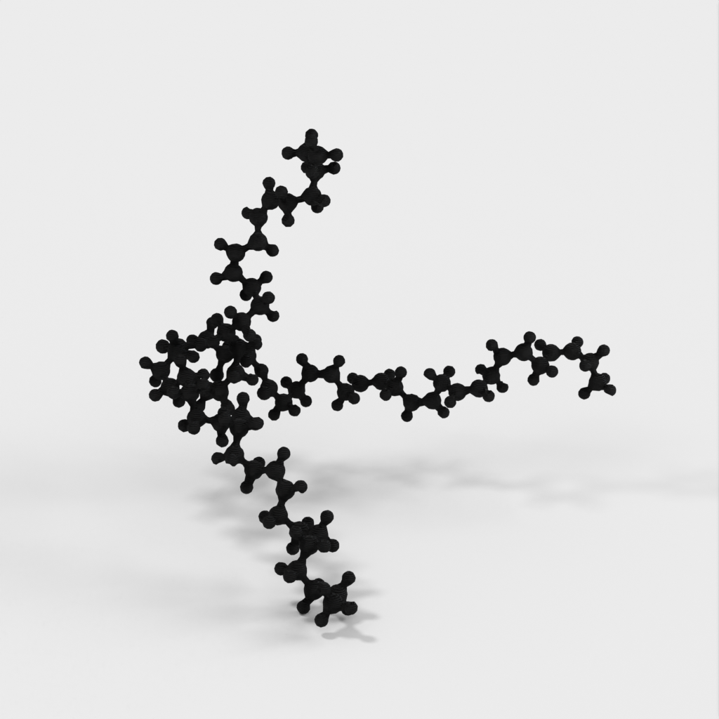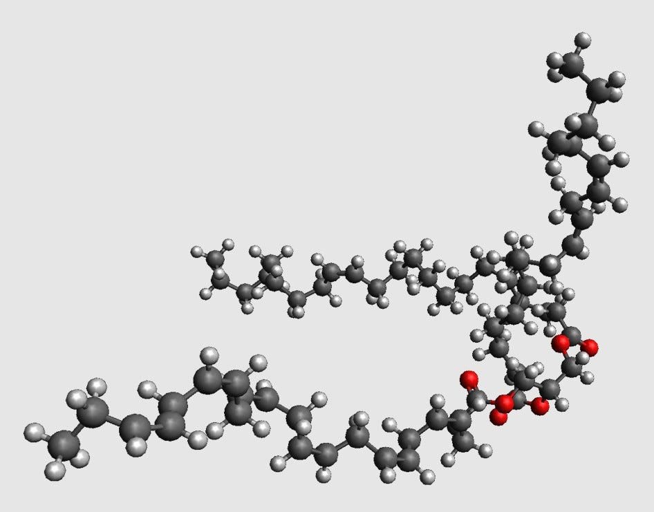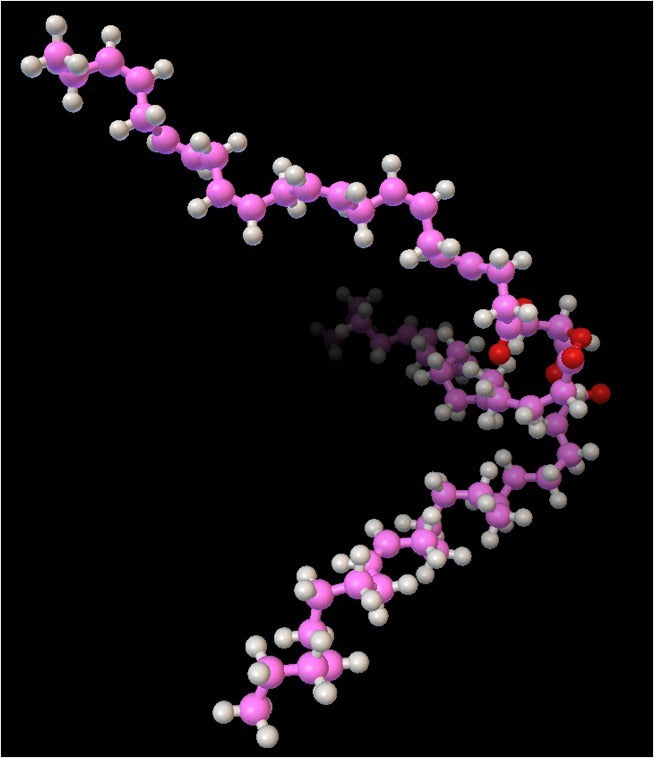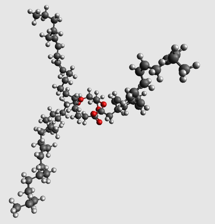 Triakliglyserolin 3d-ystävällinen, atomimittakaavan molekyylimalli. Käytä tätä mallia opetellaksesi lapsillesi kemiaa, erityisesti syömisen eri näkökohtien sekä elimistön rakennusaineiden ja energian ympärillä (tämä malli edustaa yksinkertaista rasvaa).