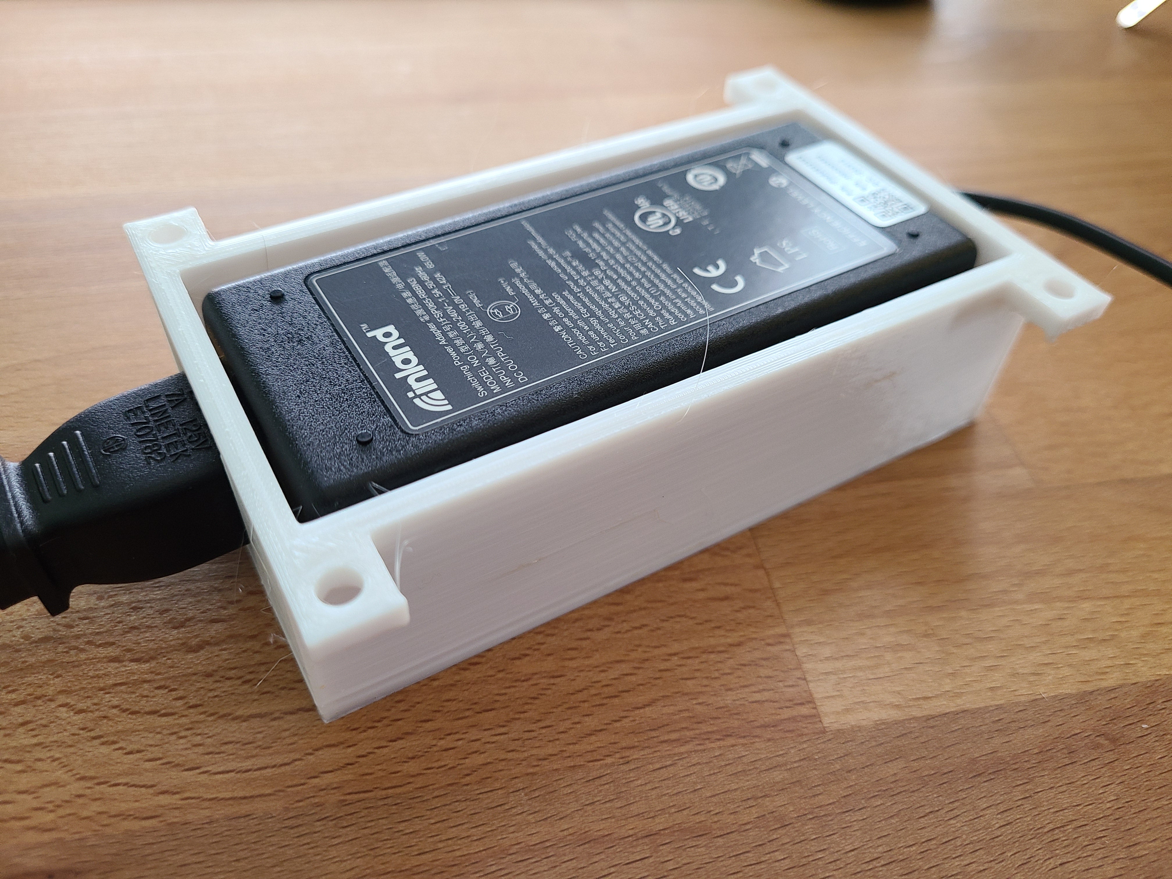 Tämä kannettavan tietokoneen virtalähteen työpöydän alle kiinnitettävä kiinnike on suunniteltu kannettavien latureiden kiinnittämiseen työpöydän alle. Se auttaa estämään latureiden katoamisen pöydältä. Se on suunniteltu erityisesti sopimaan Micro Centren Inland 65W Universal Laptop Adapteriin (osa #FSP065-RBBN3). Tuotteeseen sisältyy FreeCAD-lähdetiedosto, jonka avulla se voidaan remixata muita virtalähteitä varten.
